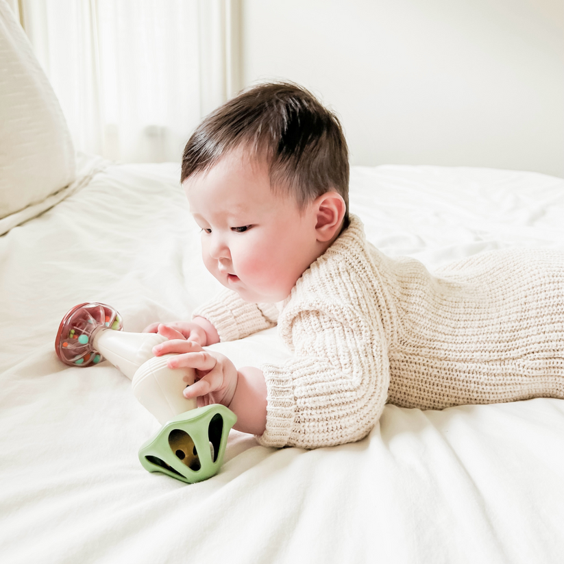 Put rhythm development within reach with these easy-to-grab Itzy Mini Maracas™! With rattle beads in one and a jingle bell in the other, baby can explore different sounds while learning hand-eye coordination and building motor skills.