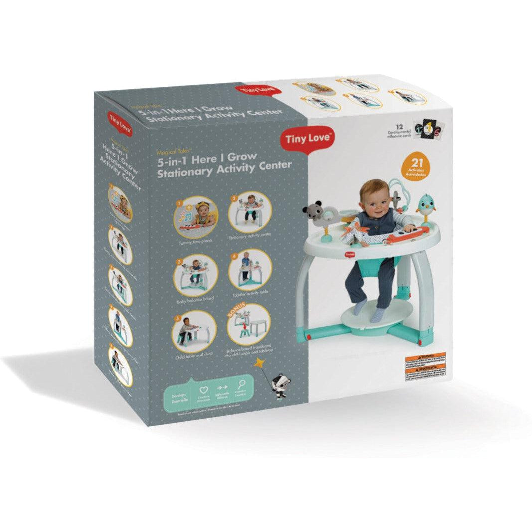With its uniquely created selection of toys that foster and strengthen skills essential to babies' growth and development, the 5-in-1 Here I Grow Stationary Activity Center is the all-in-one answer to your child's playtime needs. Featuring over 20 activities and 6 child-development toys, the activity center offers your child a world of fun and learning from birth to 36 months.