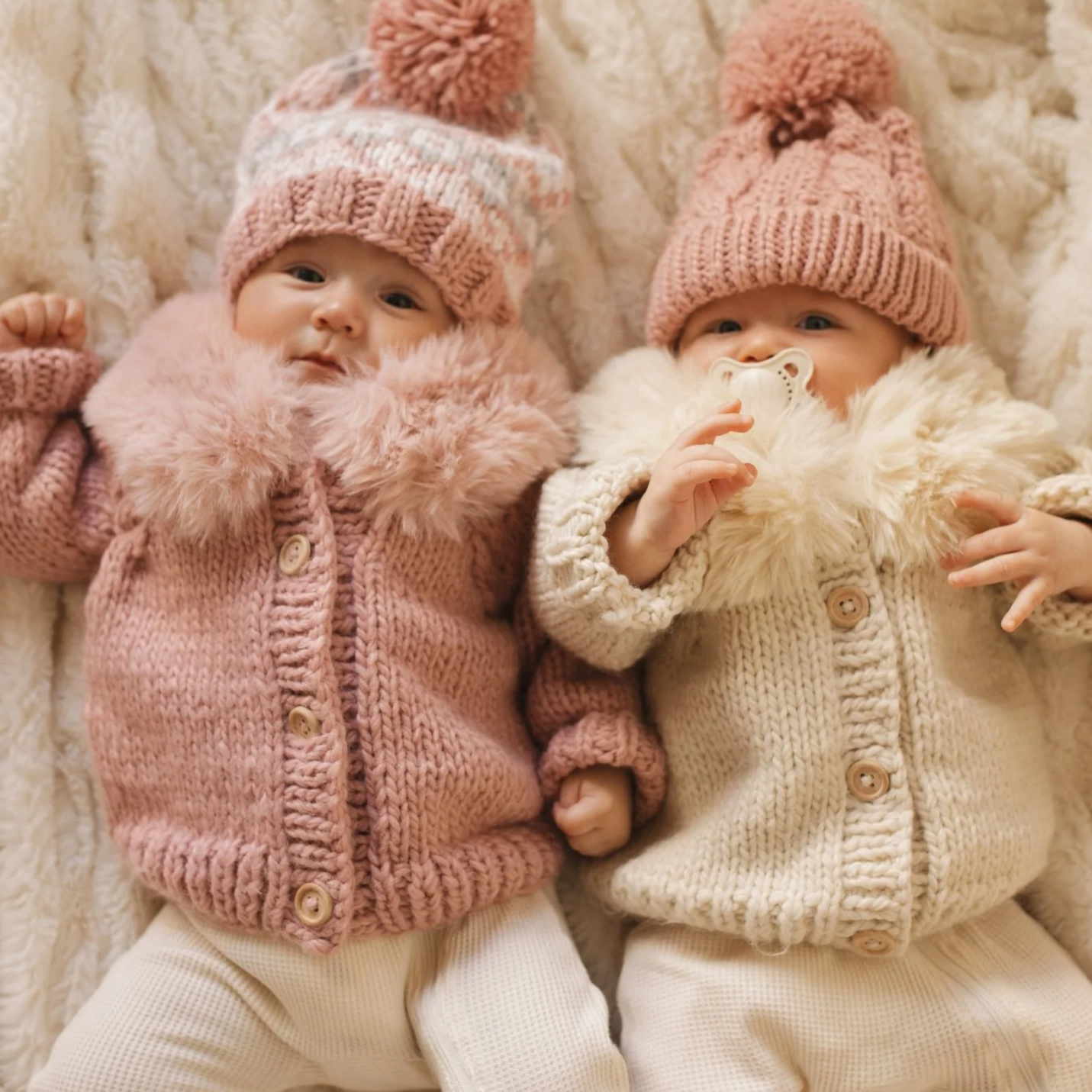 This exquisite baby cardigan sweater features a detachable faux fur collar that adds a touch of luxury to the design. Hand-knit in chunky, Rosy Pink hued yarn, the sweater showcases cabled raglan sleeves and closes with natural wood buttons for a classic look.
