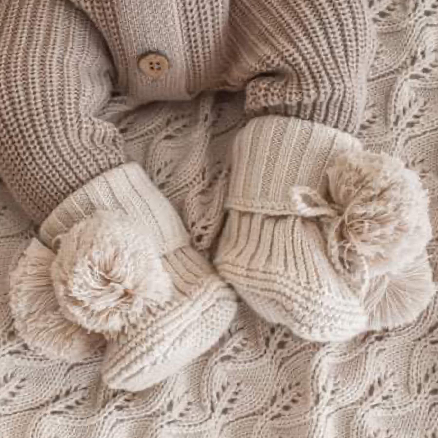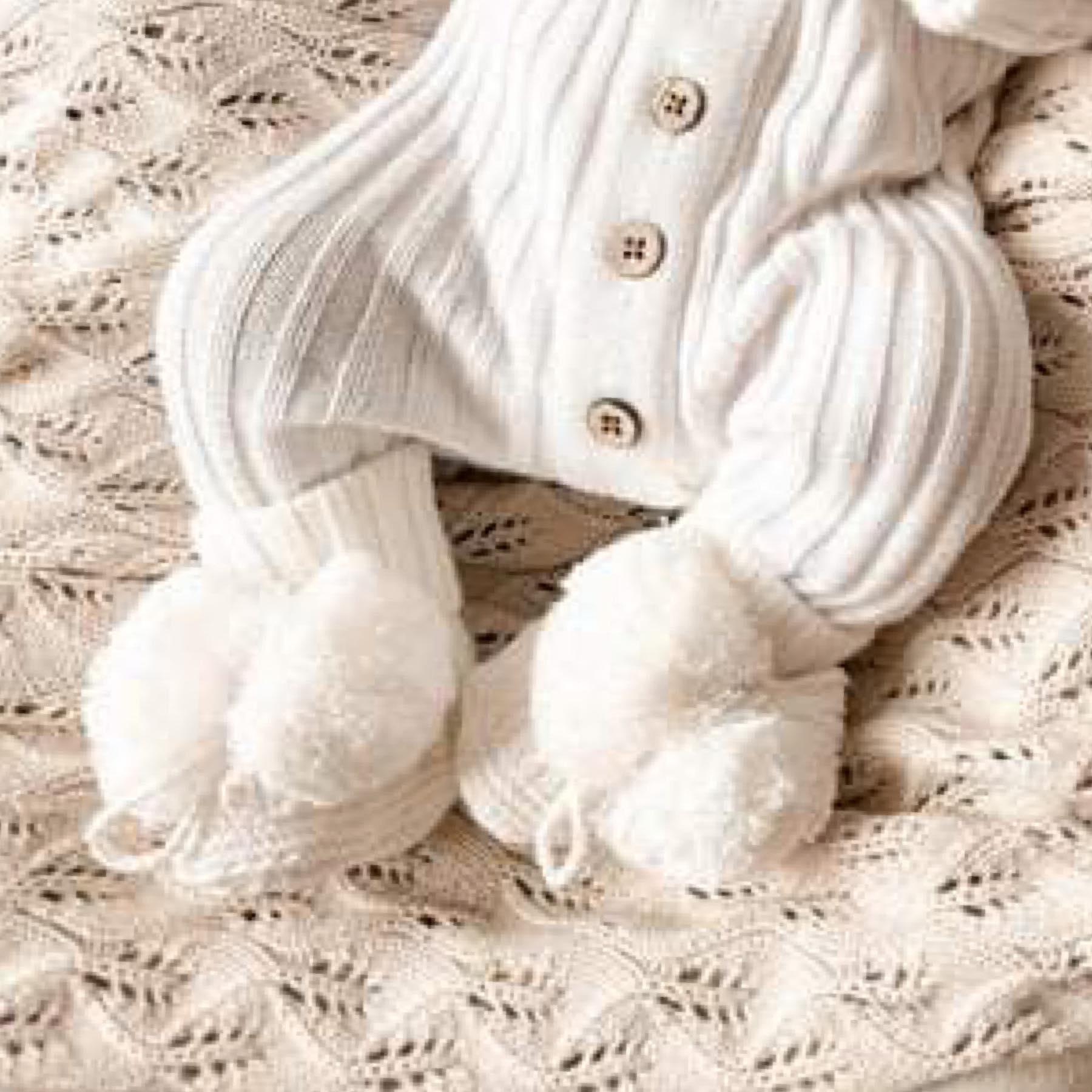 Made from 100% cotton, Little B's knitted booties are comfortable and cozy for your precious little ones toes. Featuring the sweetest oversized pom poms and a functional draw string.