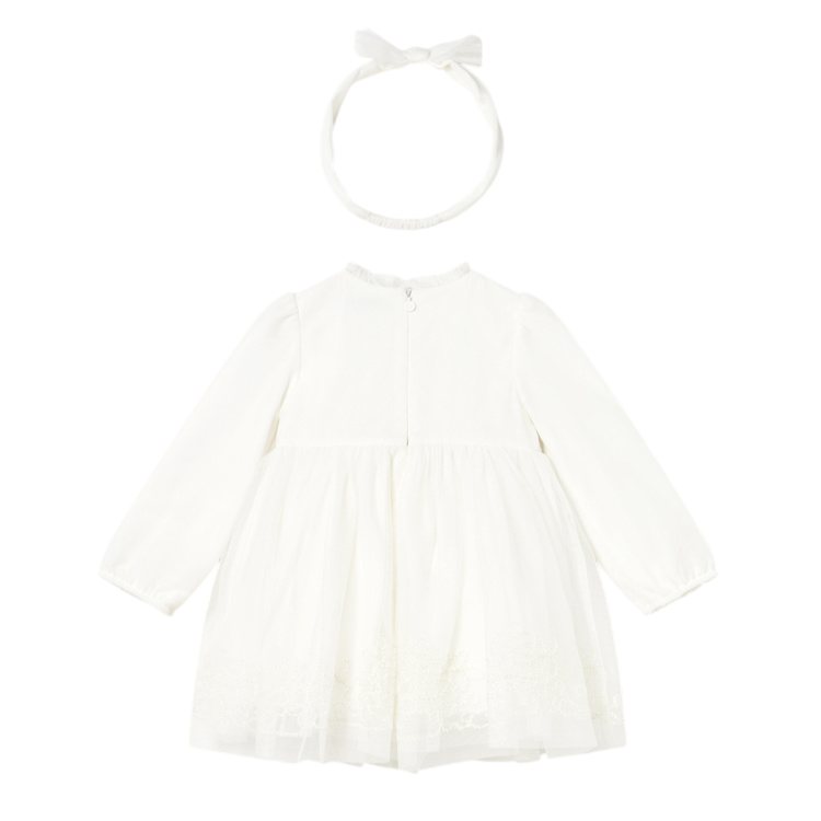 A beautiful occasion set for baby girls, featuring a delicate embroidered tulle dress with a matching ceremony headband. The long-sleeved dress is fully lined for comfort, with an invisible back zip for easy dressing.
