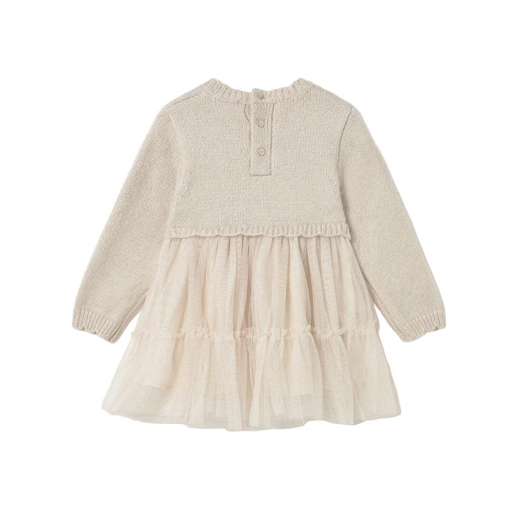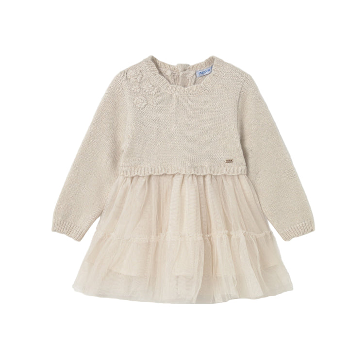 Bring a touch of elegance to your little one’s wardrobe with the Mayoral Knit and Tulle Dress in Sand Mix. This long-sleeved baby dress features a charming waved collar and a cozy knit top designed to look like a layered sweater.