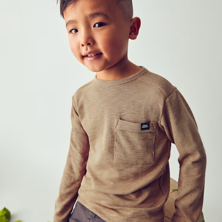 A soft, textured knit tee designed for toddlers in transitional weather. Features a round neck, ribbed trims, and breathable cotton fabric. A comfortable foundational piece for everyday wear.