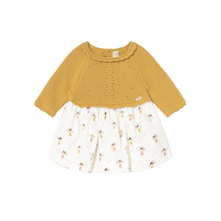 The dress is made with a unique combination of fabrics in the body and skirt, creating a special, textured look. Gathered details and a delicate patterned design complete this adorable outfit, perfect for everyday wear or special occasions.