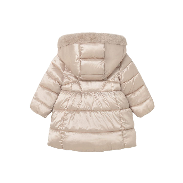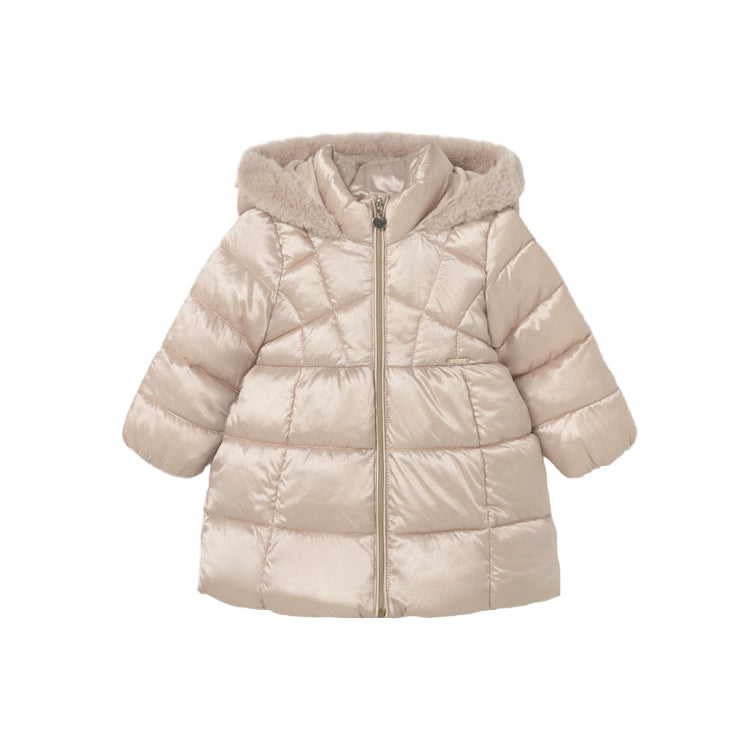 Keep your little one warm and stylish with the Mayoral Puffer Jacket in Tapioca. Made with soft, recycled polyester, this long-sleeved jacket features elasticated cuffs, a cozy hood with faux fur detailing, and a soft polyester lining for comfort.