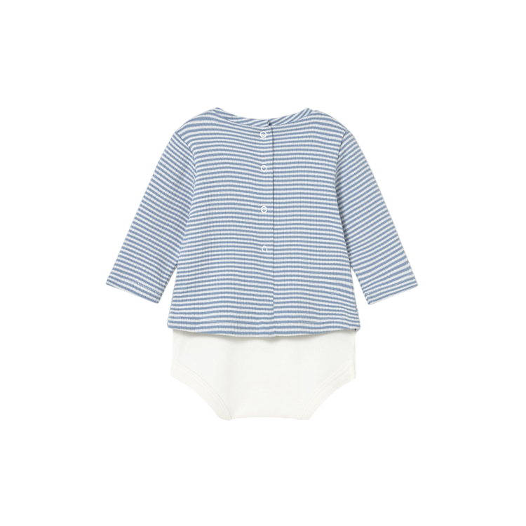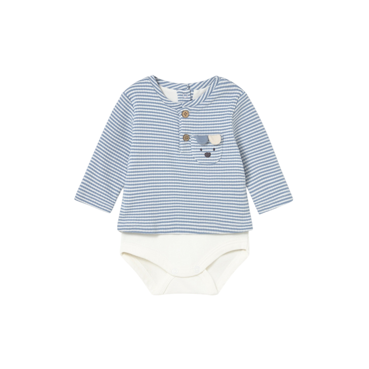 A sweet long-sleeved bodysuit for newborn baby boys, crafted from soft, stretchy cotton for all-day comfort. Features a round neckline, snap closure at the back, and button fastenings down the front for easy dressing.