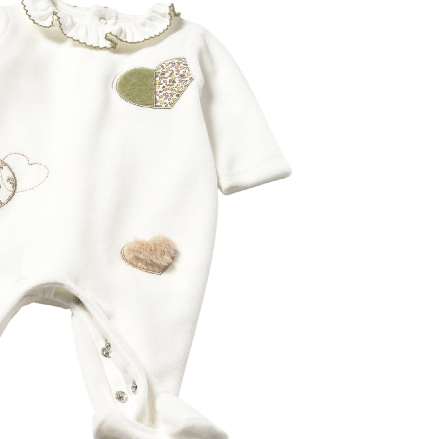 Keep your newborn cozy and stylish with the Mayoral Velour One-Piece in Ecru. Made from soft, plush velour, this outfit features a comfortable baby neckline, convenient back snap closure, and snap buttons at the crotch for easy dressing and quick changes.