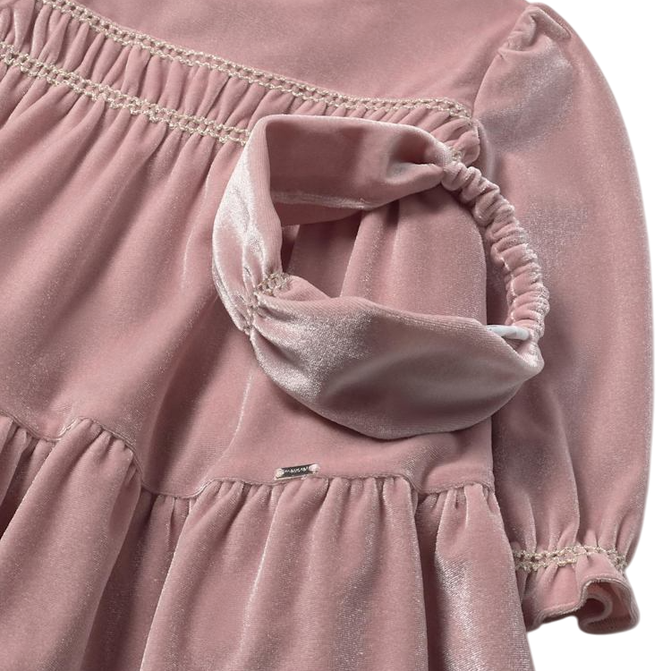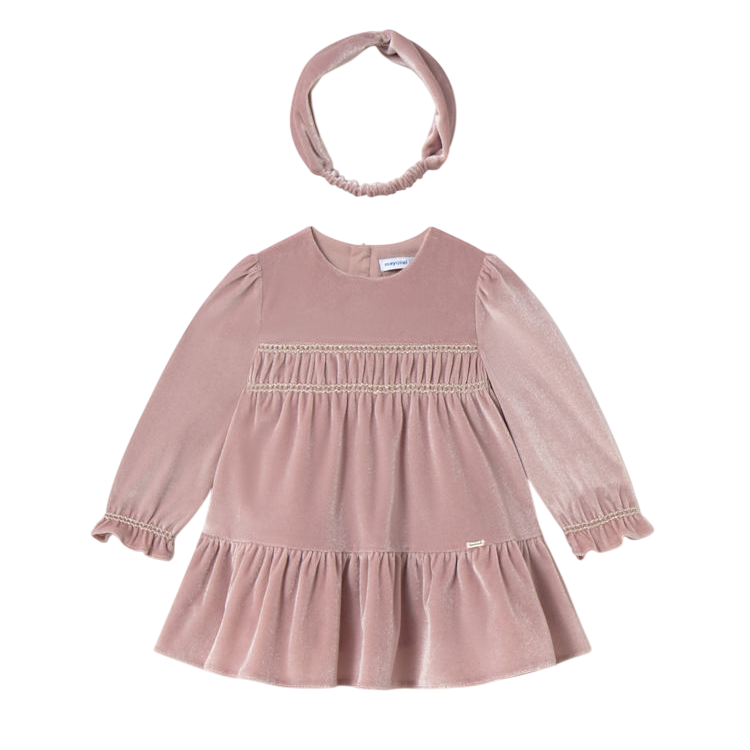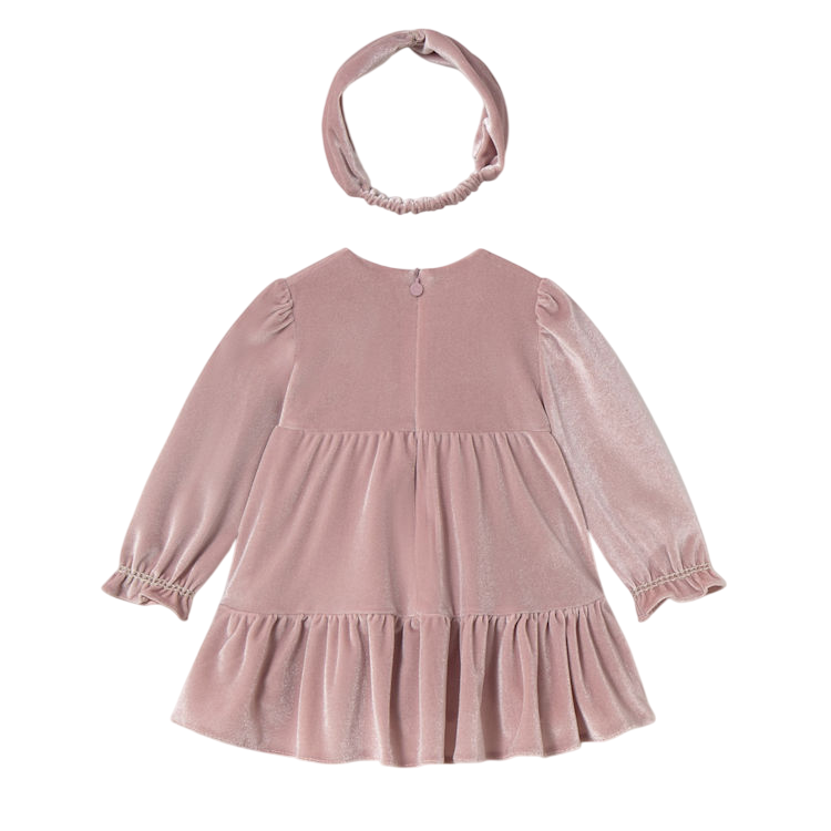 An elegant velvet occasion set for baby girls, featuring a long-sleeved dress with delicate ruffle accents and a matching headband.