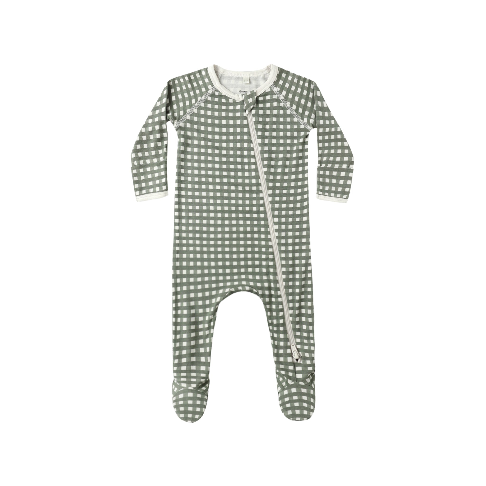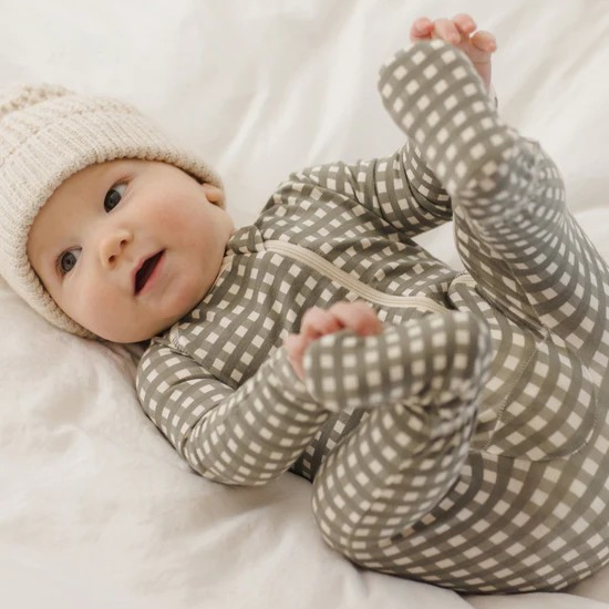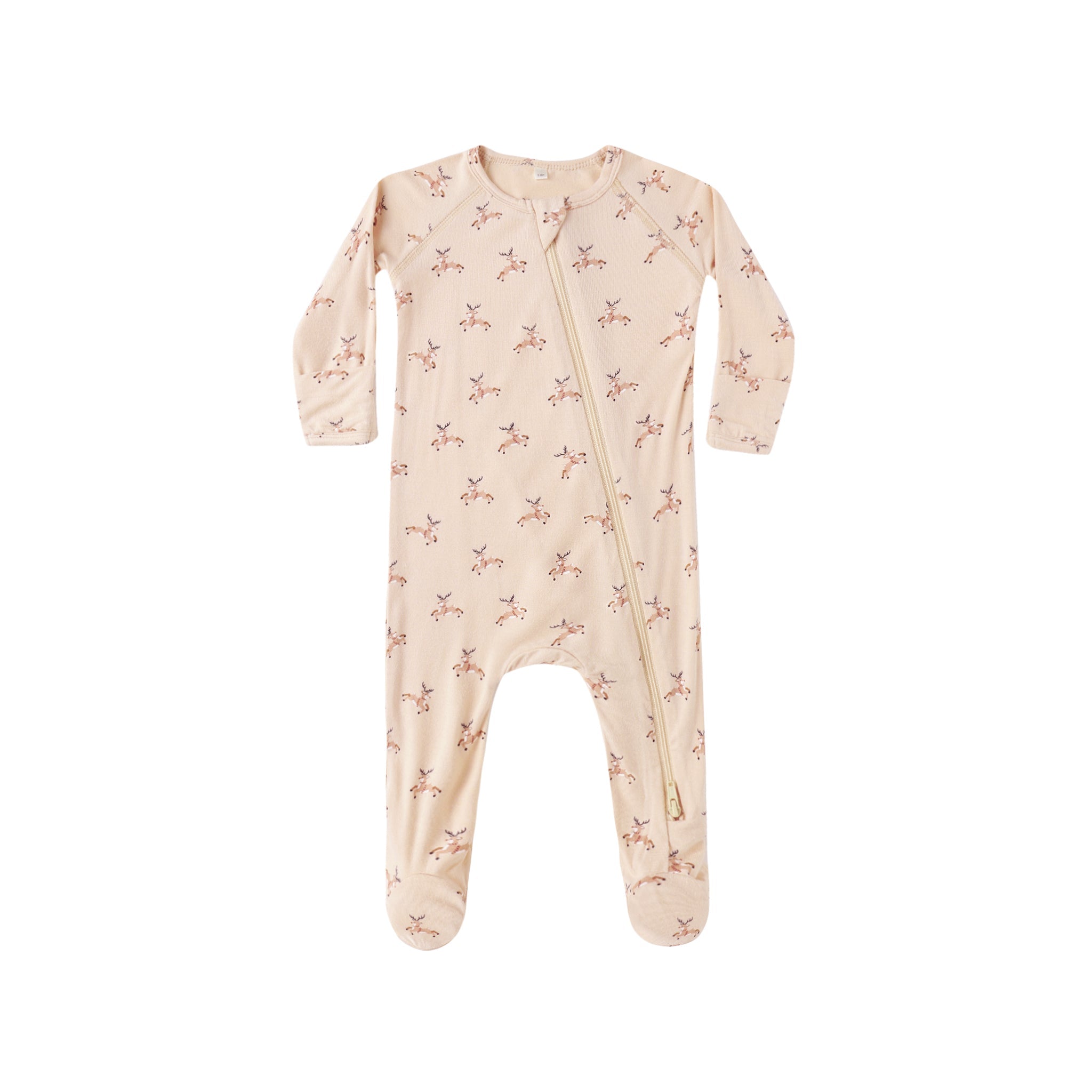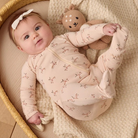 Full double-zip footie crafted from soft and stretchy bamboo fabric. Fold-over hand mitts included on sizes NB – 3-6M. Raised screen print on soles of size 6-12M for added traction.