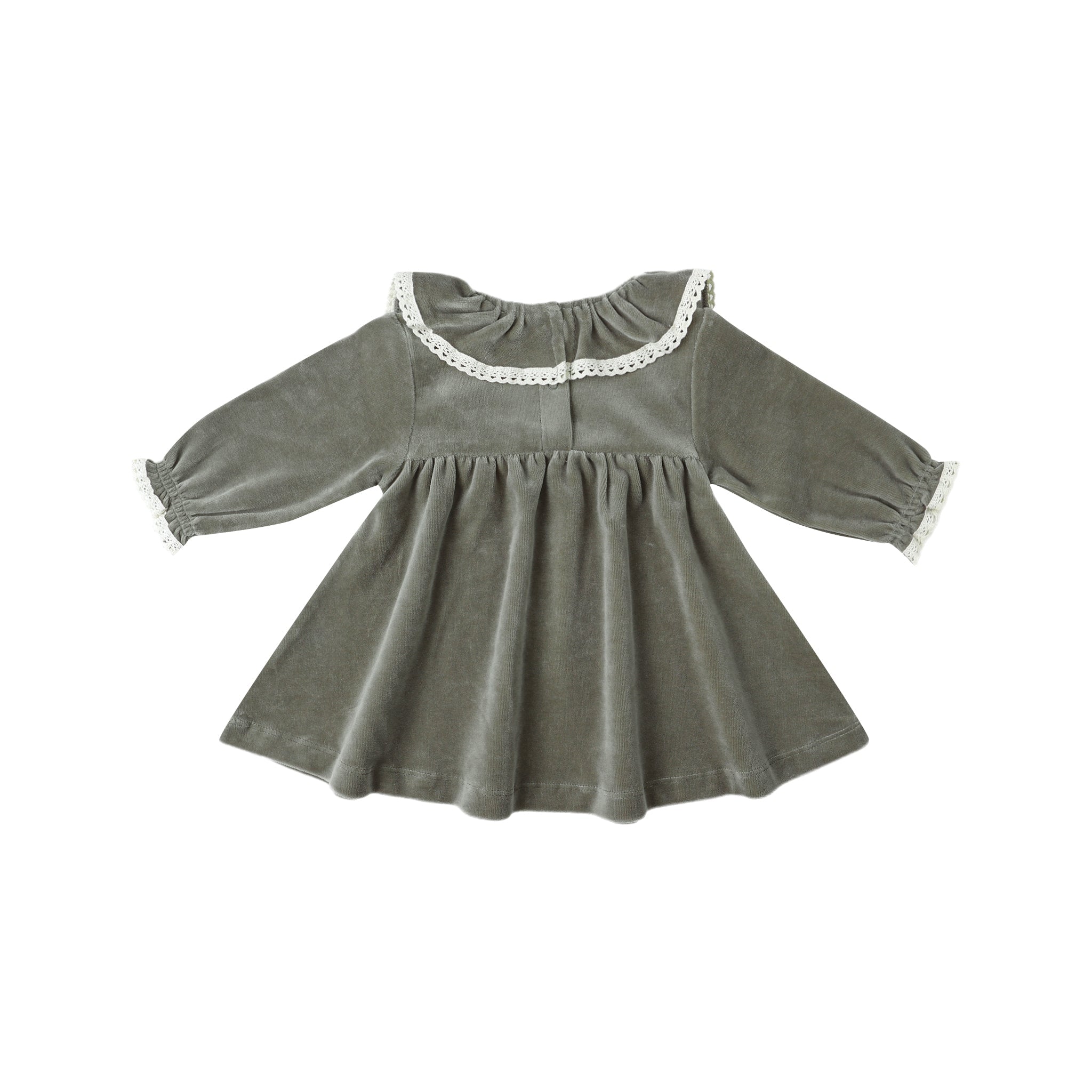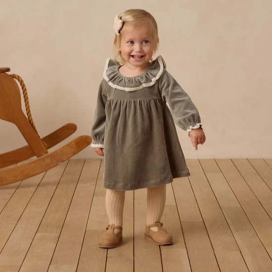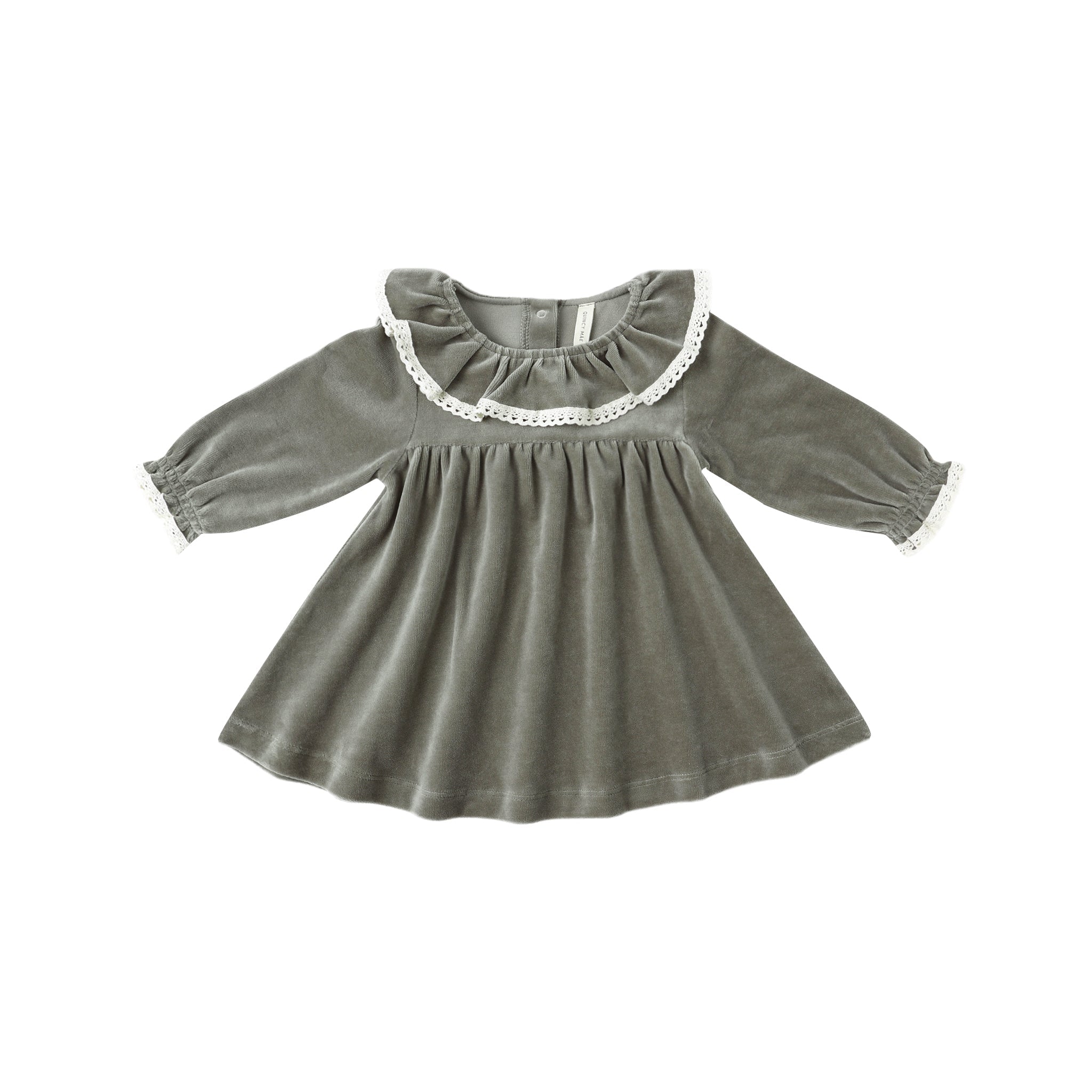 Quincy Mae's Velour Baby Dress features an empire waist dress with long sleeves and a cute, ruffled collar.