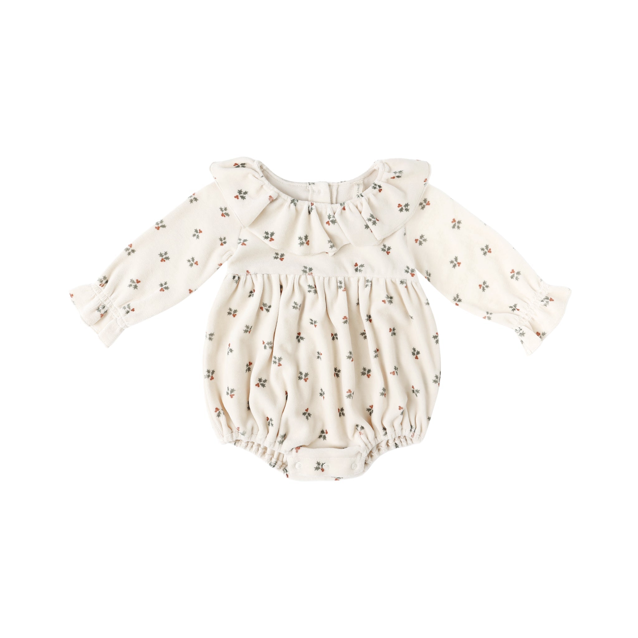 Long sleeve velour romper with gathered waist and ruffle collar. Snap closures along the inseam for easy changing.