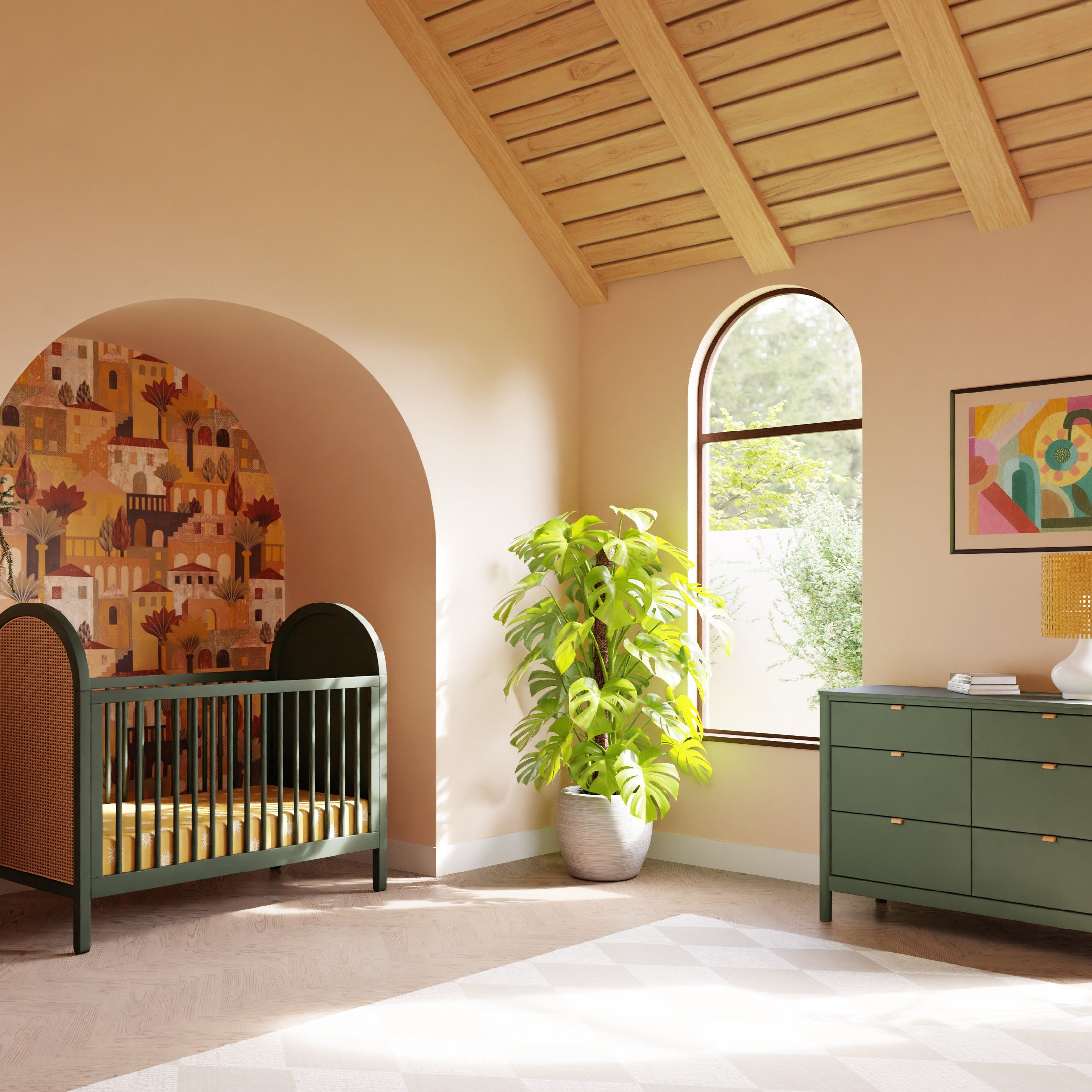 The Bondi Cane 3-in-1 Convertible Crib celebrates boho-inspired design and natural materials with its warm wood tone, playfully arched side panels, curved feet, and woven plant-based cane. The Bondi is designed to grow with your babe using an included toddler bed conversion rail and is screened for harmful chemical emissions to ensure it meets GREENGUARD GOLD Certification.