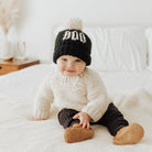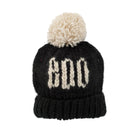 Get ready for Halloween in this fun hat with the word BOO on the front. Knit in black yarn, the word BOO is knit in natural. It's trimmed with a matching black cuff and natural yarn pom pom. Hand knit in cozy, thick acrylic yarn, this hat perfect for fall and makes a great gift!