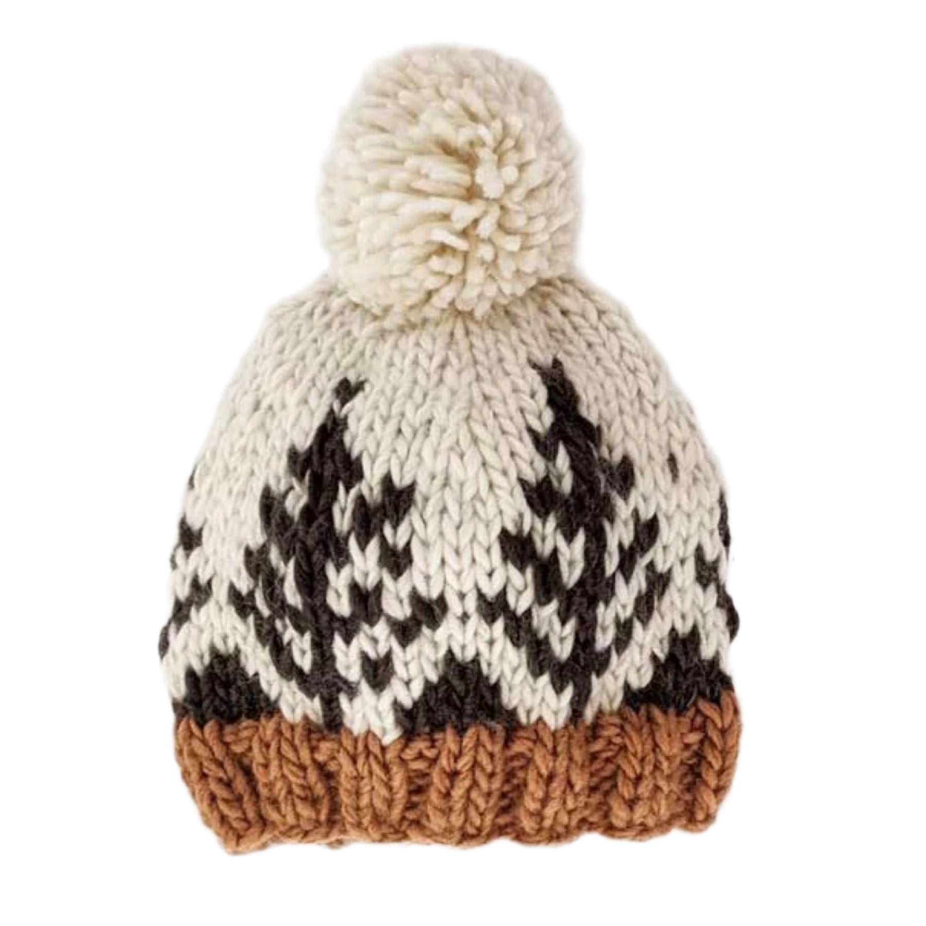 Feel part of nature in our forest beanie. Natural colored hat has trees knit in deep loden green and trimmed in a pecan brown ribbed cuff. It's topped with a matching yarn pom pom. Hand knit in cozy, thick acrylic yarn, this hat is sure to bring smiles and makes a great gift!