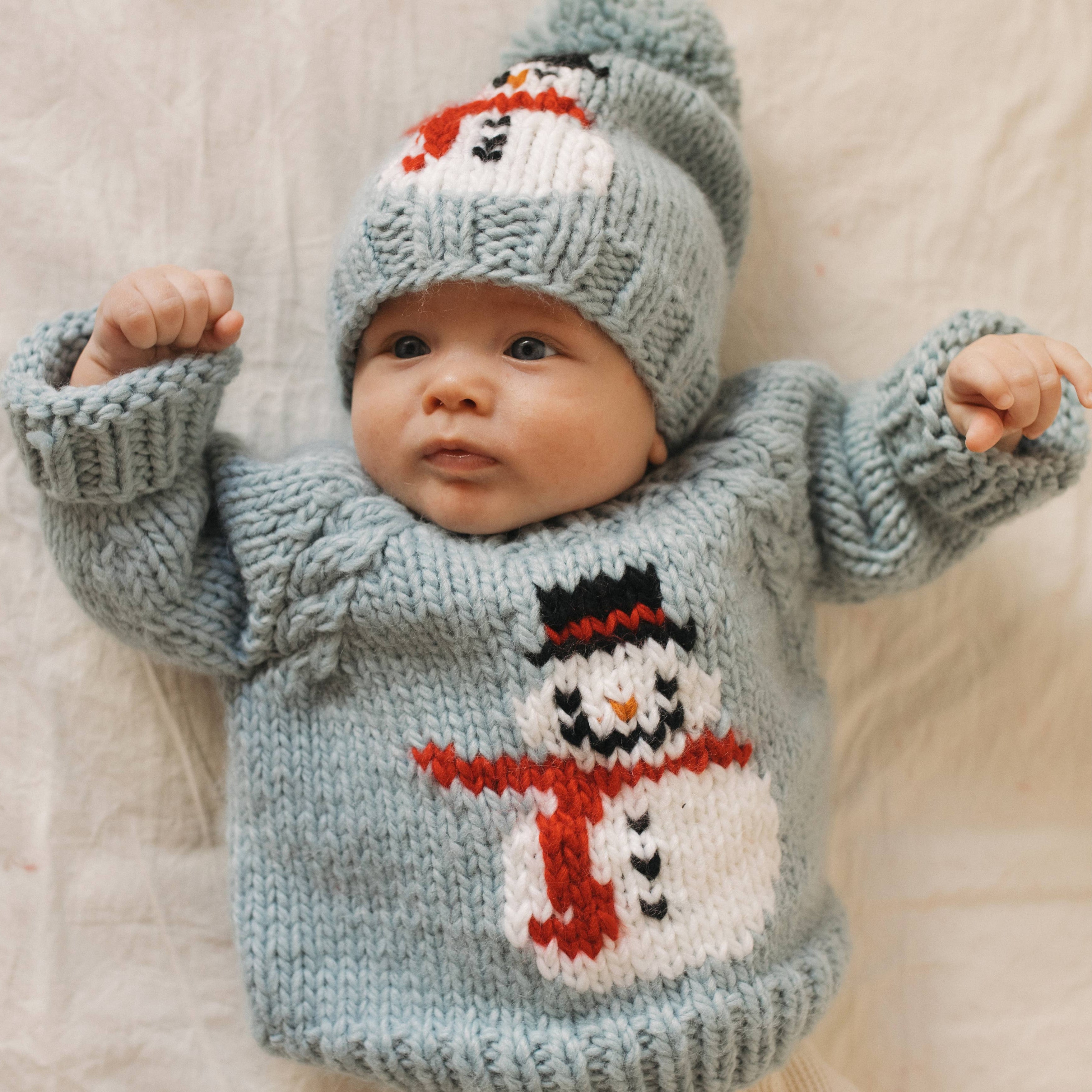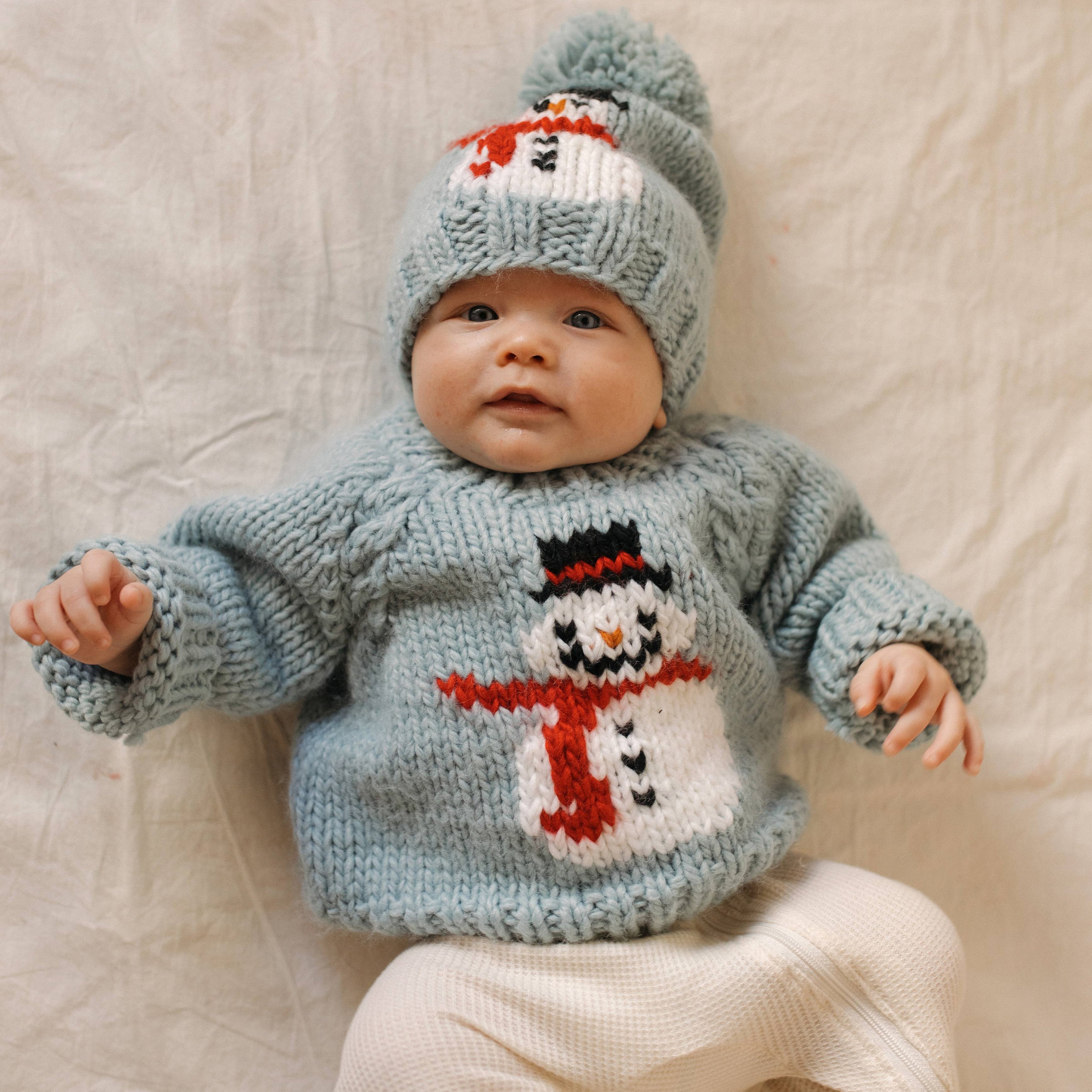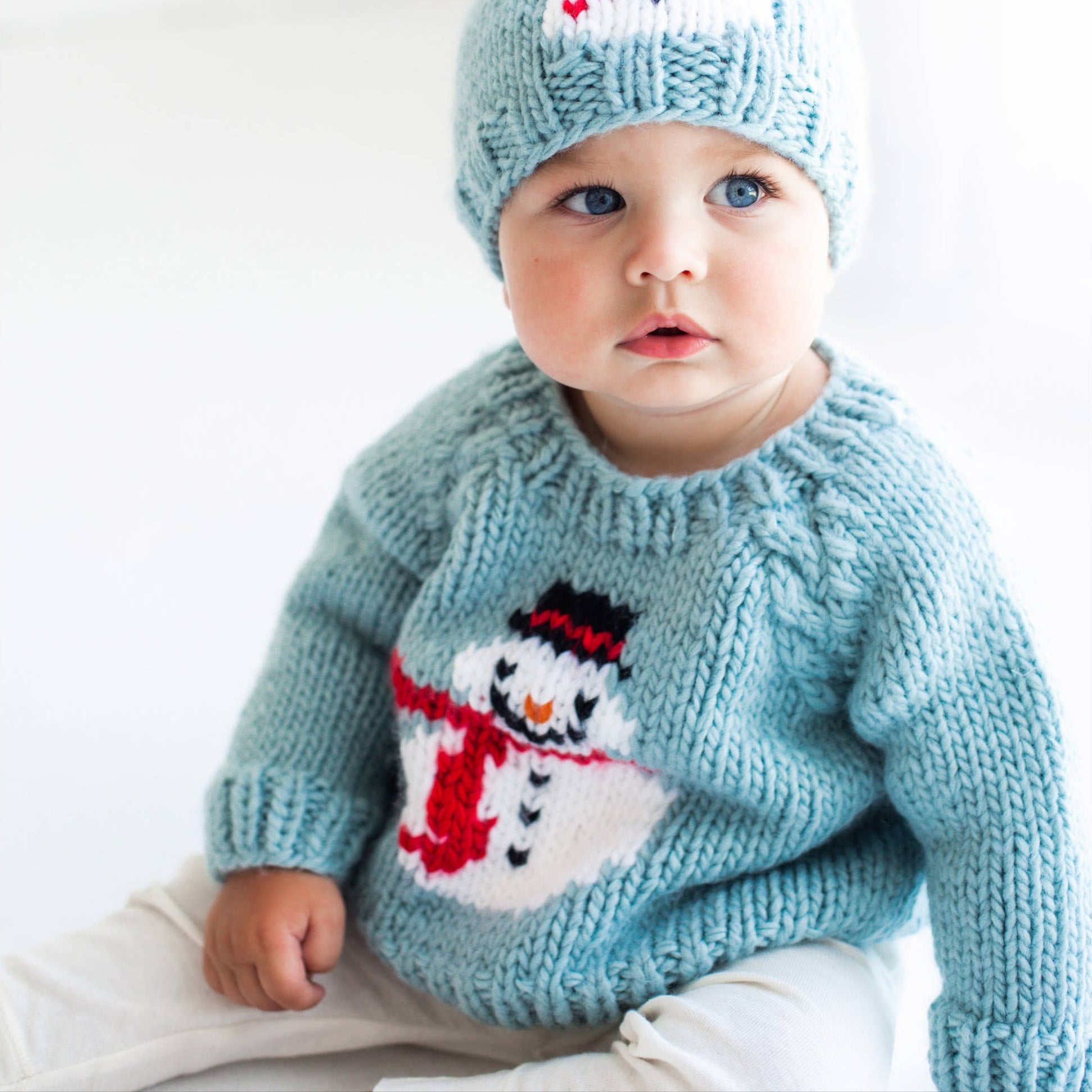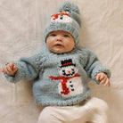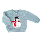 This charming hand-knit sweater features an adorable Frosty the snowman design on the front, perfect for the winter season. The deep Surf Blue color and chunky yarn give it a cozy feel, while the raglan sleeves with cable knit detailing add a touch of sophistication. The soft neckline ensures easy dressing for your little one, making it a practical choice for busy mornings.