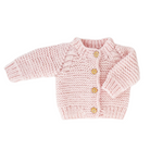 This cozy, hand-knit cardigan features a thick garter stitch with charming cable-trimmed raglan sleeves and wooden buttons. Crafted in a sweet blush pink, it’s perfect for keeping little ones warm and snug.