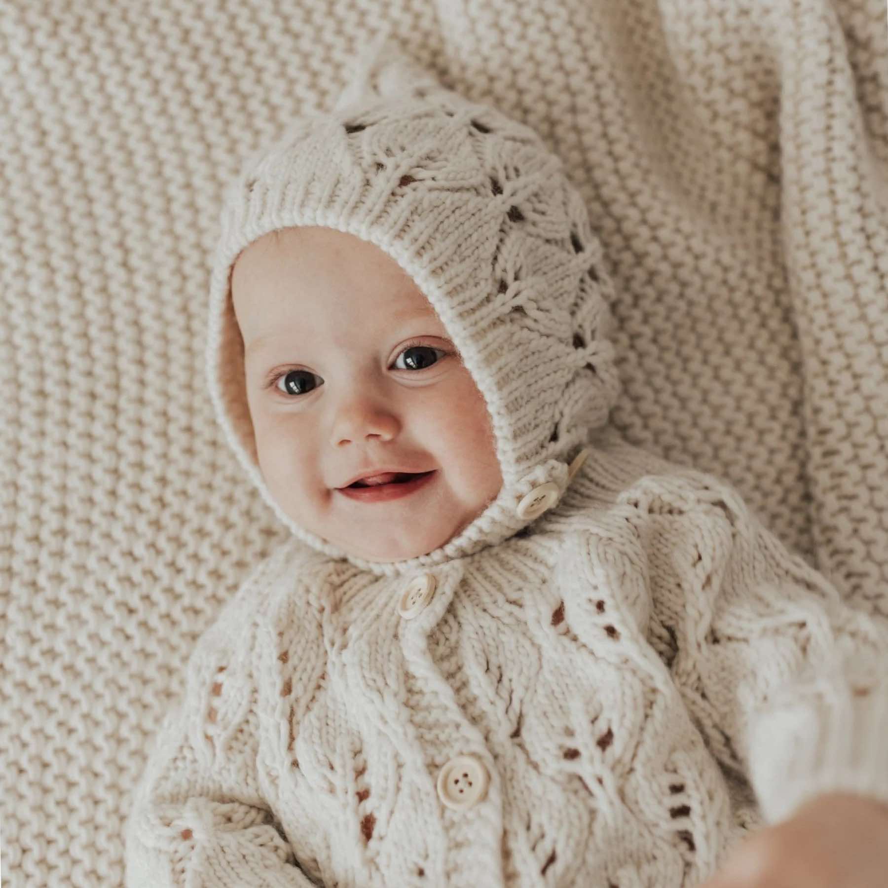 Wrap your little one in charm with the Leaf Lace Bonnet Natural, a delightful knit bonnet featuring an intricate leaf pattern that adds a touch of whimsy to any outfit. Crafted from soft, natural-hued acrylic yarn, it feels gentle against delicate skin while offering cozy warmth.