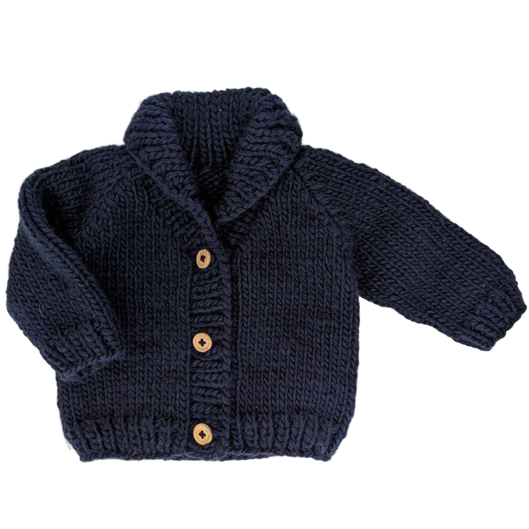 Here's a baby sweater that combines timeless style with modern comfort. This hand-knit chunky cardigan features a shawl collar and raglan sleeves, providing a fresh twist on a traditional design.