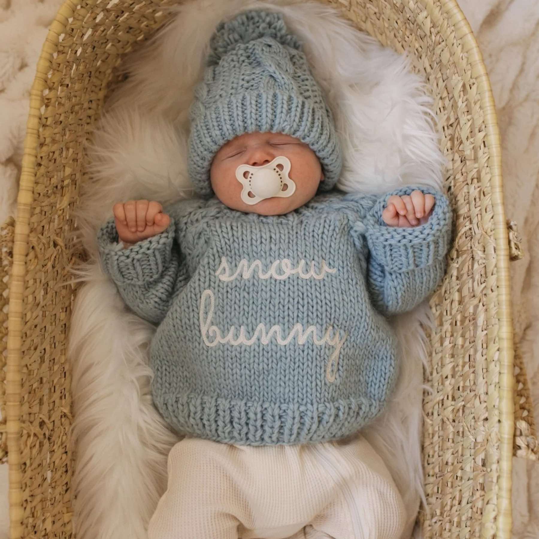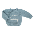 This hand-knit sweater features the words 'snow bunny' embroidered in Natural hued yarn on the front, adding a charming touch to your child's winter wardrobe. The Surf blue color and chunky yarn provide a cozy feel, while the raglan sleeves with cable knit detailing add a touch of sophistication. With its soft neckline, this sweater ensures easy dressing for your little one, making it a practical choice for busy mornings.