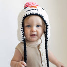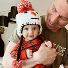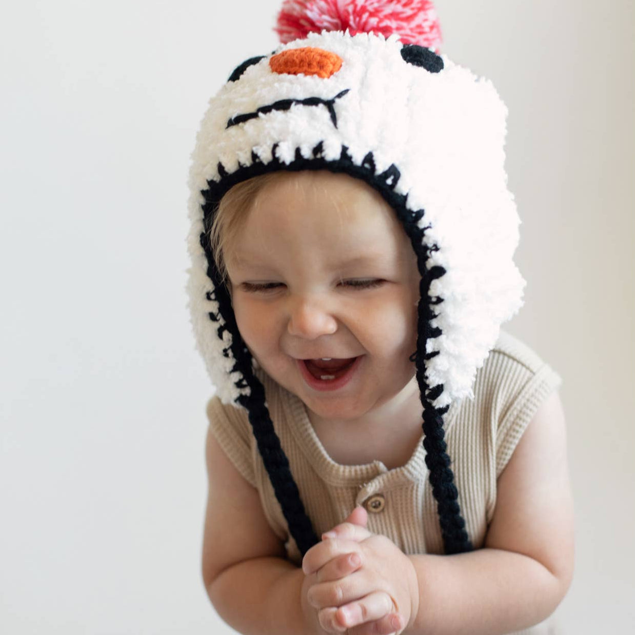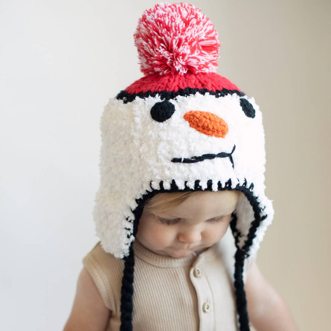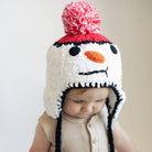 Ultra soft snowman beanie is perfect for chilly weather. Earflap style hat is trimmed with a snowman face and is accented with red and white pom poms.
