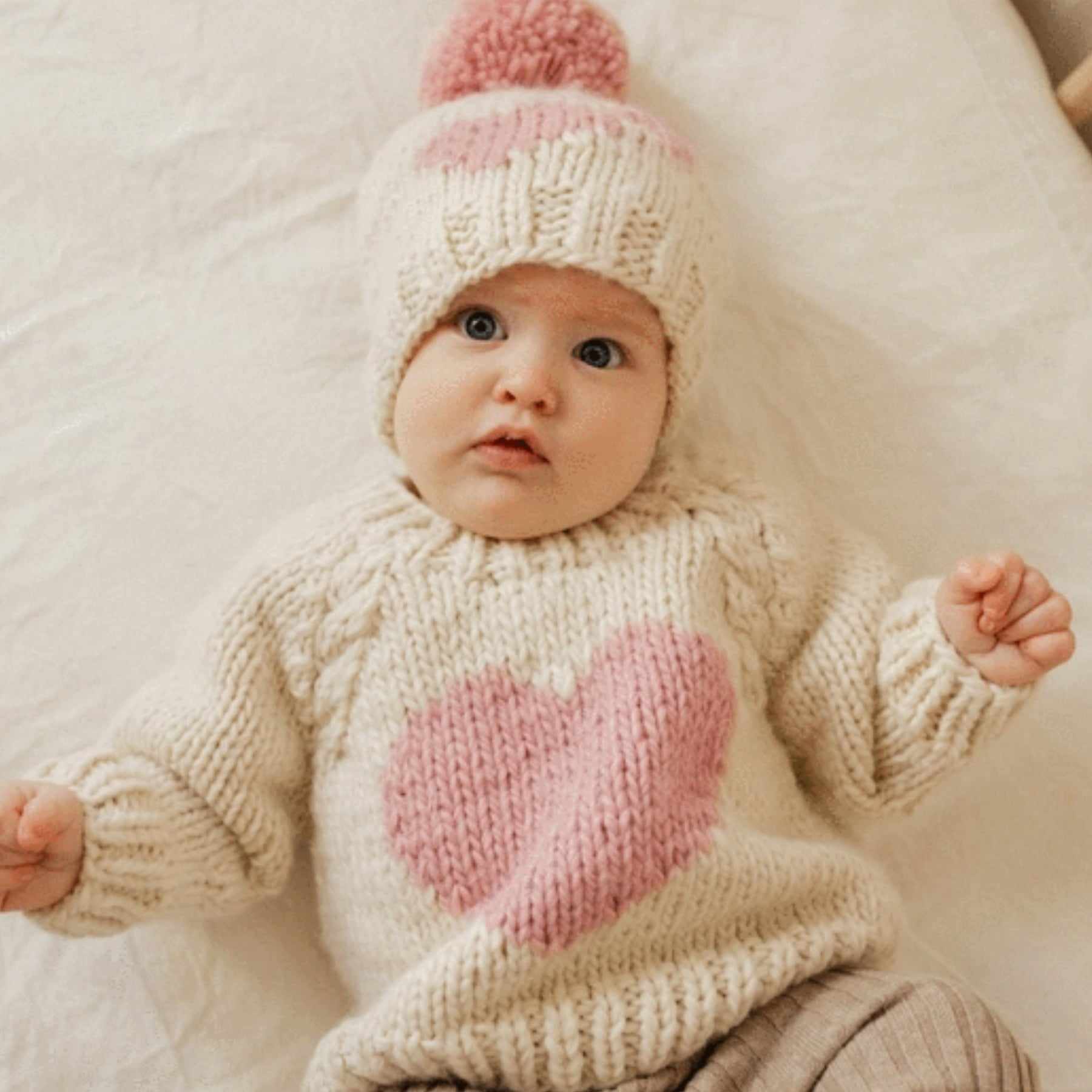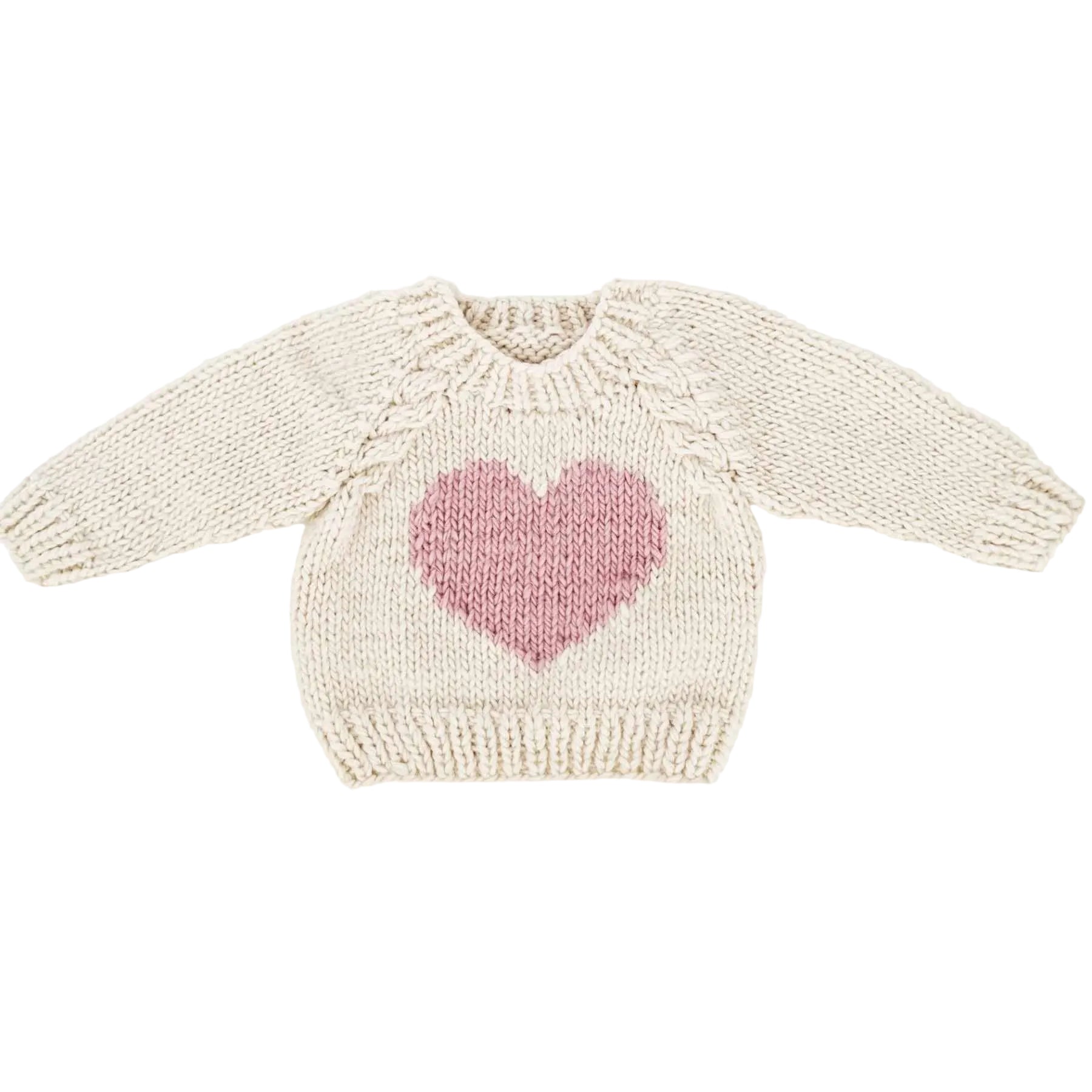 Celebrate love with Huggalugs Sweetheart Sweater. Hand-knit in chunky yarn, this crew neck sweater in Natural has a Heart knit in Rosy Pink yarn. Hand knit, it is soft and warm.