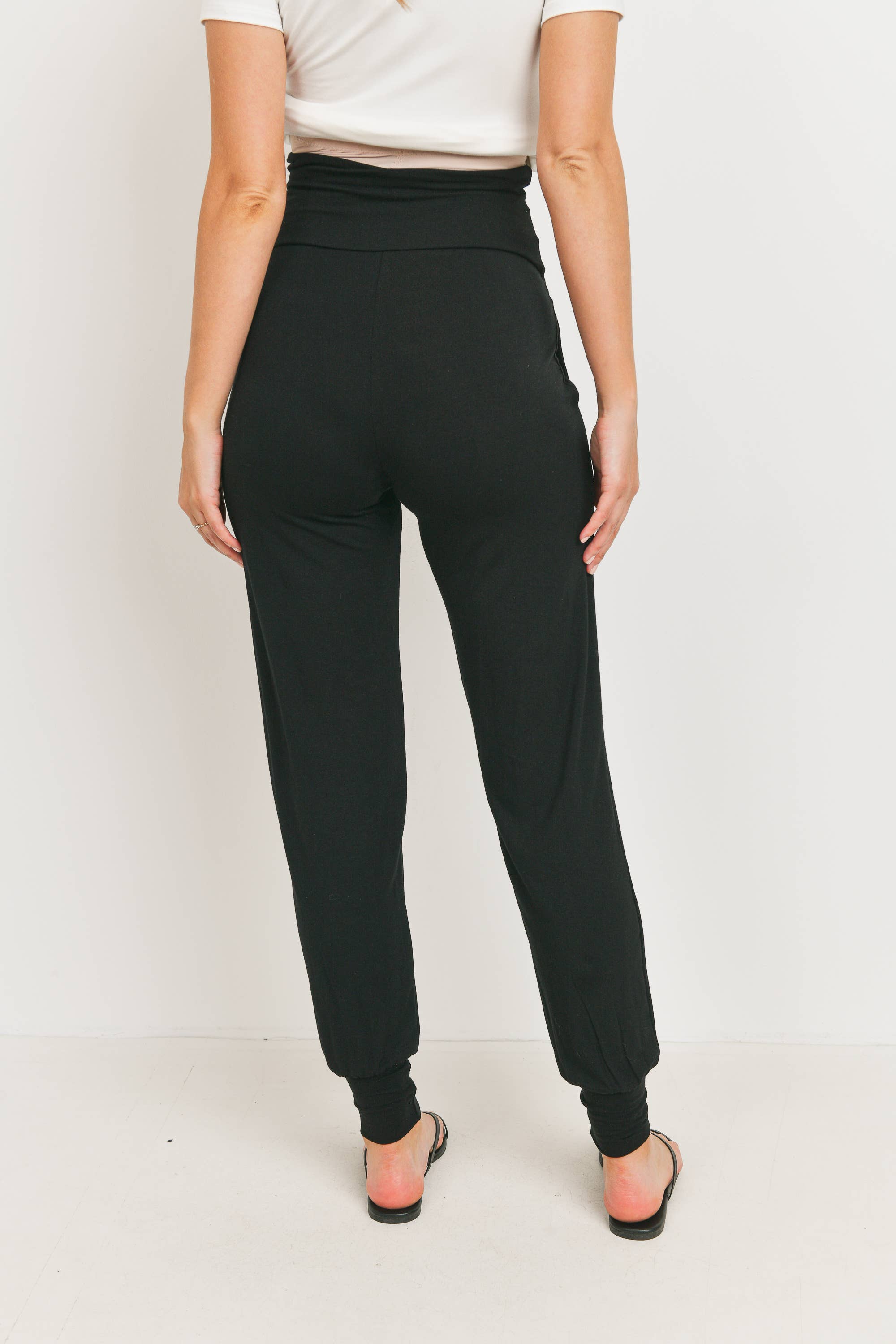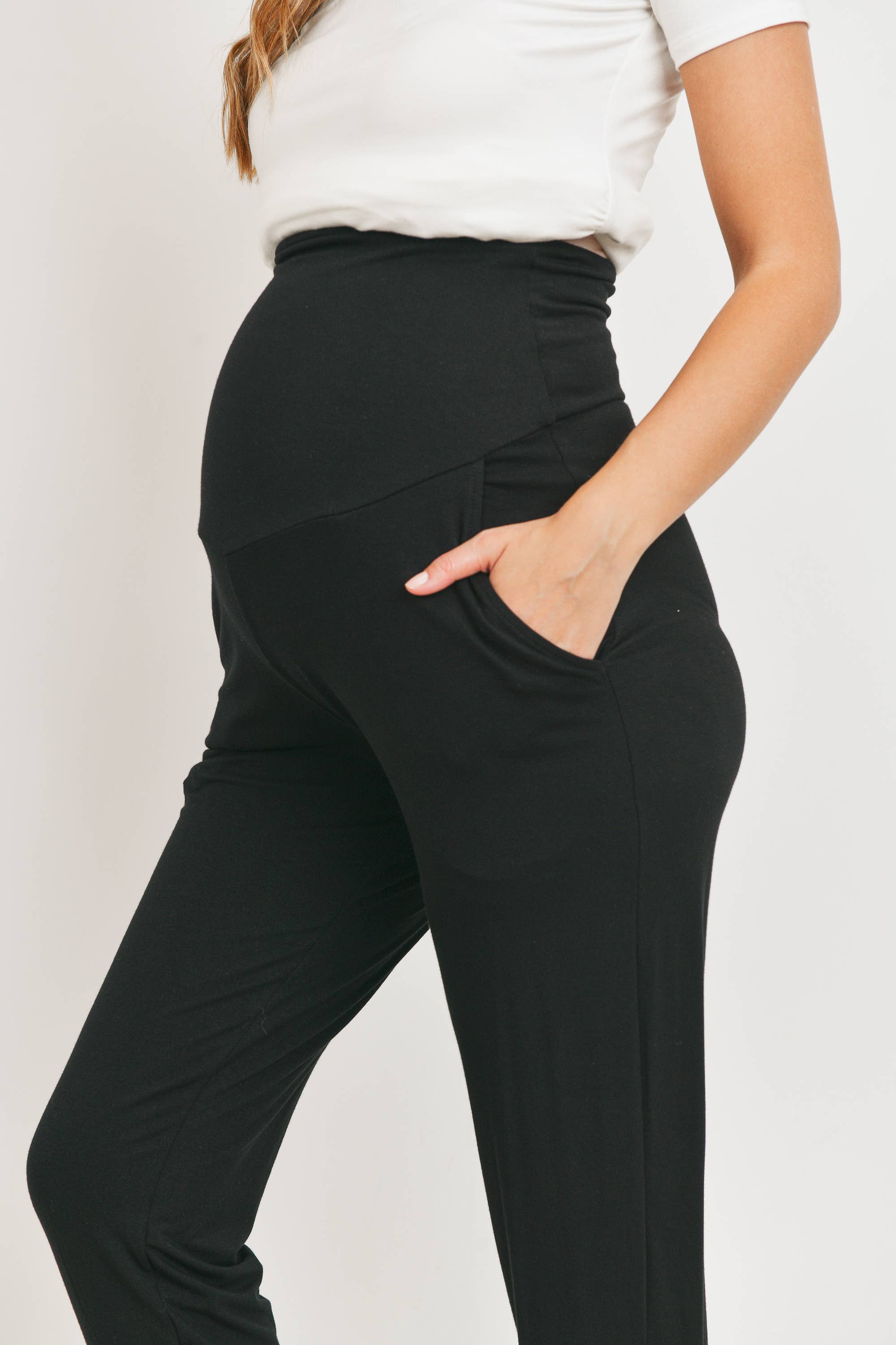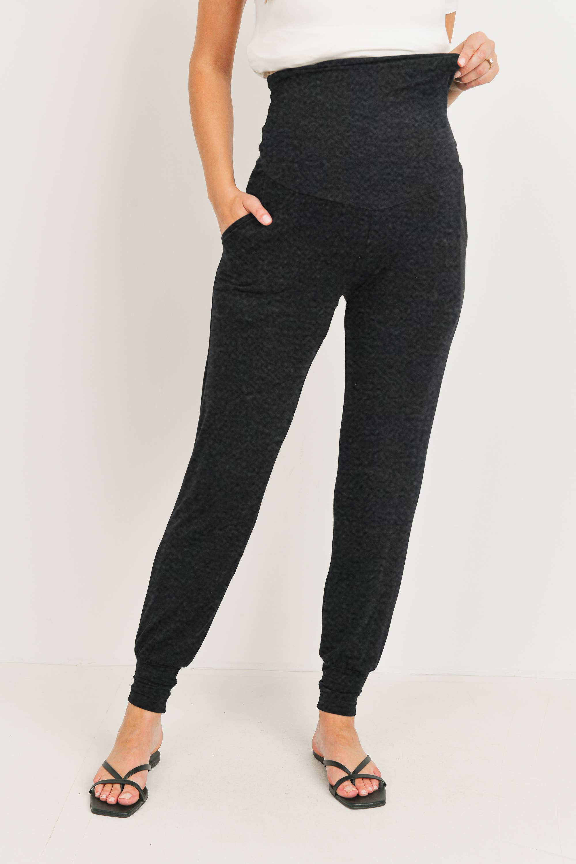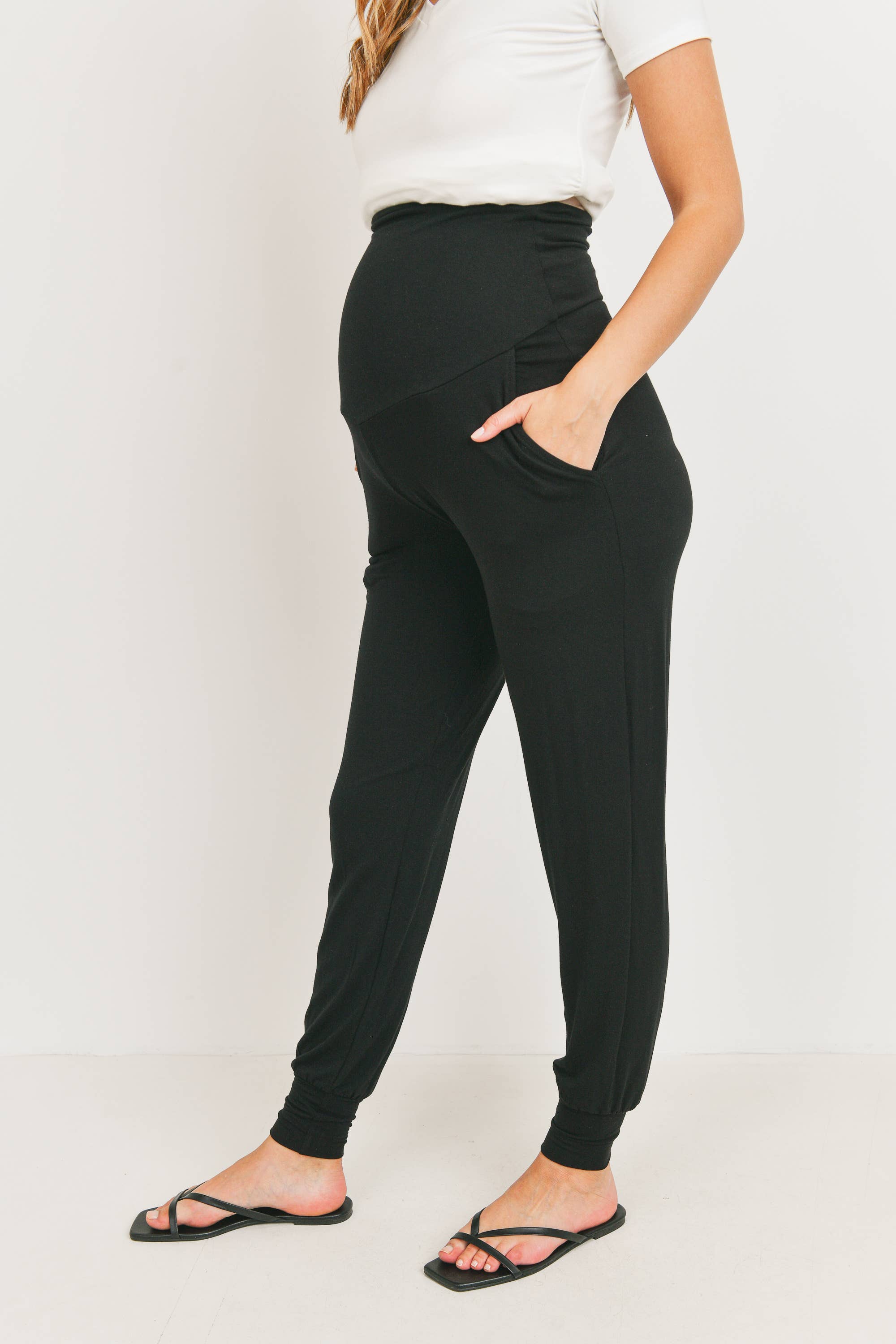 The fold-over waistband provides gentle belly support, while side pockets add everyday convenience. Perfect for lounging, errands, or casual outings, these maternity joggers combine comfort, function, and effortless style.