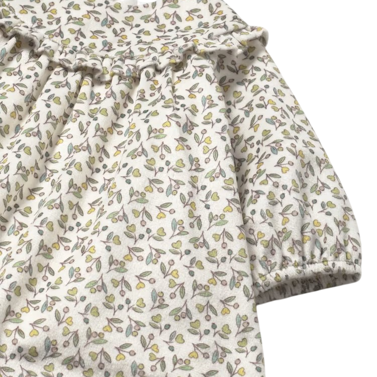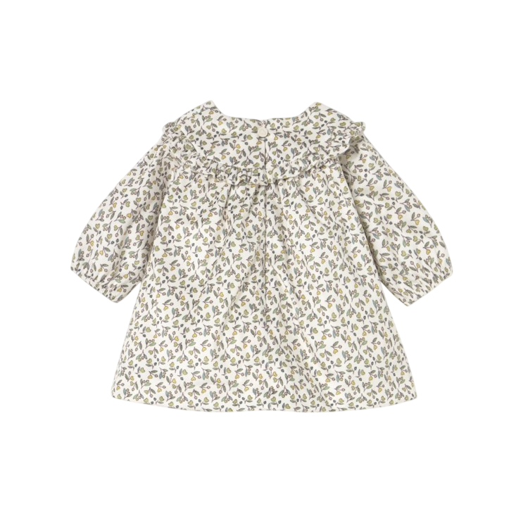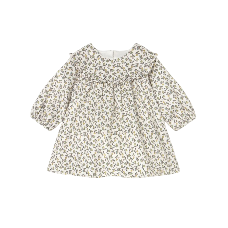 This softly gathered dress features long sleeves, an allover print, and ruffle accents for a timeless baby look. Elastic cuffs and a hidden zip back make dressing easy, while the whimsical pattern adds charm to every occasion.