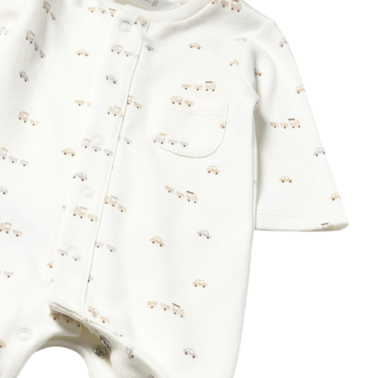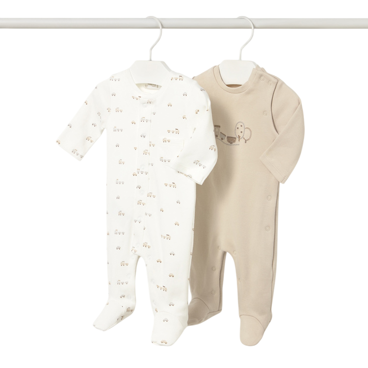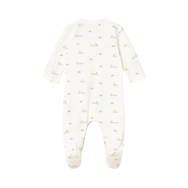 Keep your newborn cozy and stylish with the Mayoral Train Print One-Piece in Ecru. Made from soft 100% cotton this outfit features a comfortable baby neckline, convenient shoulder snap closure, and snap buttons for easy dressing and quick changes.
