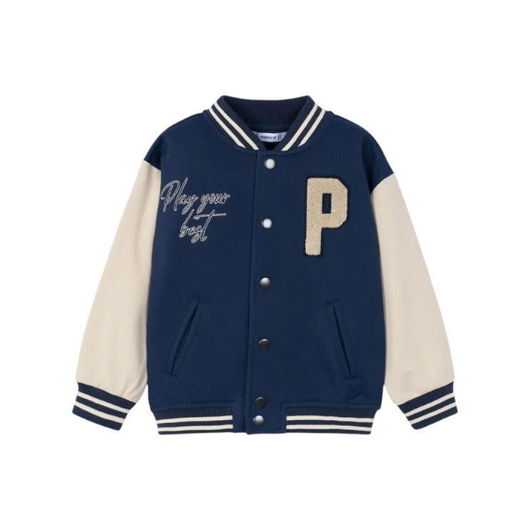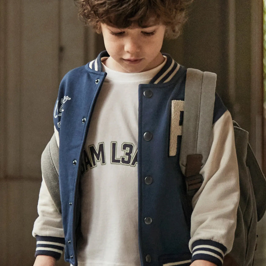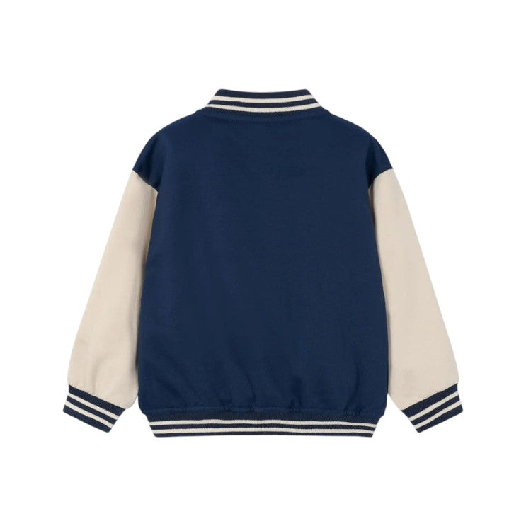 Give your little one a stylish, sporty edge with this classic bomber-style varsity jacket. Designed in navy blue with contrasting cream-white sleeves and striped trim at the collar, hem, and cuffs, it captures timeless varsity style.