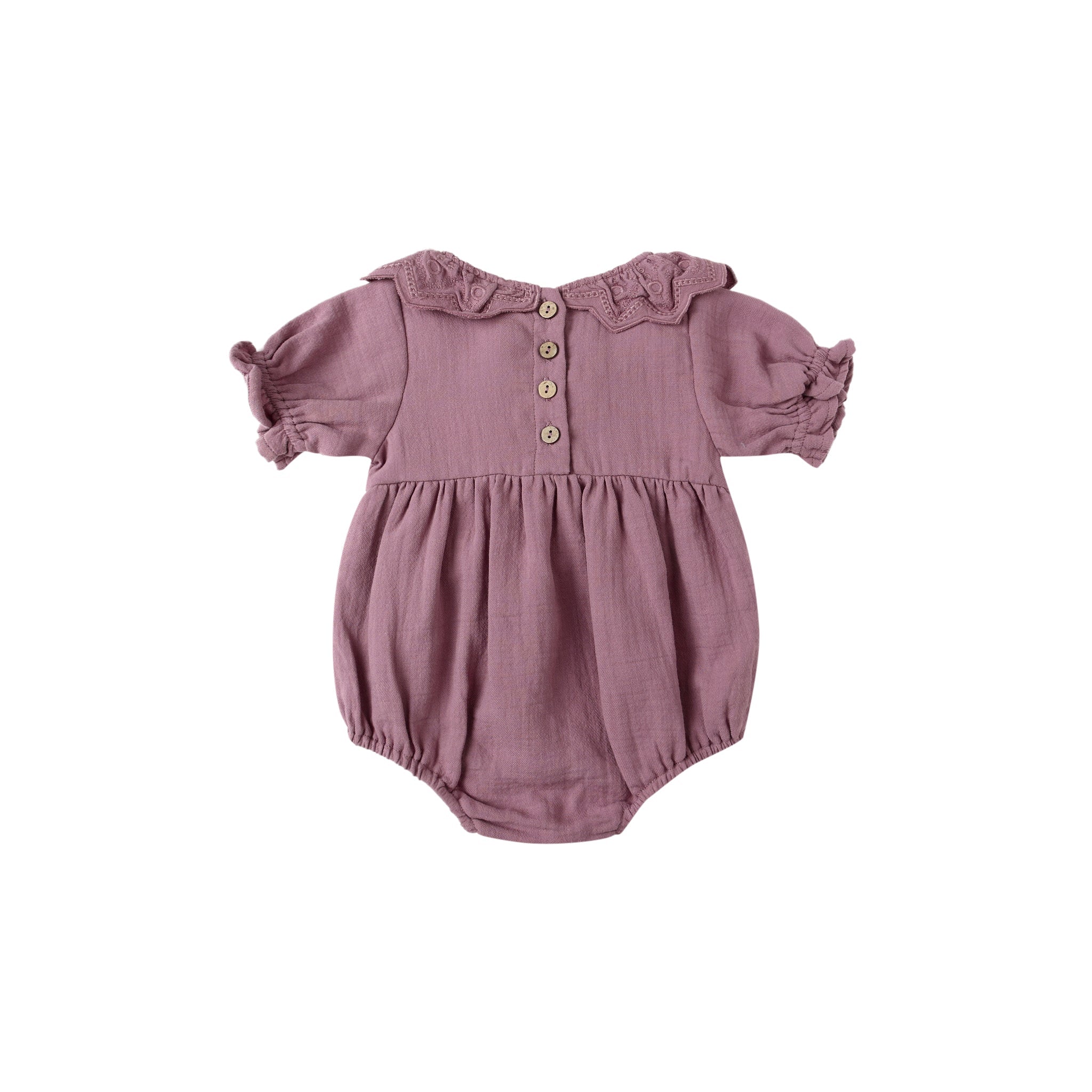 A sweet romper with a collar, short puff sleeves, and ruffle details, finished with back buttons and bottom snaps for easy changing.