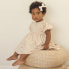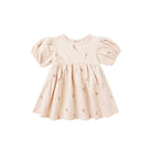 Quincy Mae's fleece Darla Dress features a babydoll silhouette with an empire waist, balloon sleeves, and a coconut button keyhole at the back. Coordinating bloomers included with all sizes.