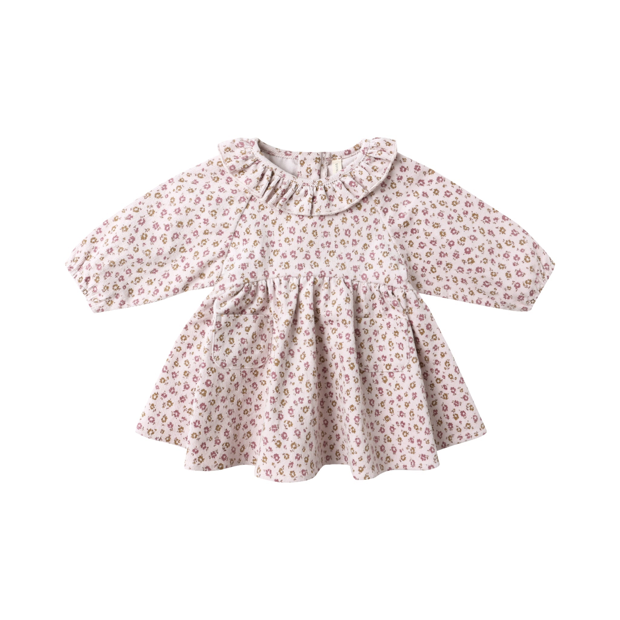 Quincy Mae's sweet Simone Dress features long sleeves, a curved waistline, front patch pockets, and a darling collar. A zipper at the back allows for easy dressing—perfect for everyday charm and comfort. Coordinating bloomers included with all sizes.