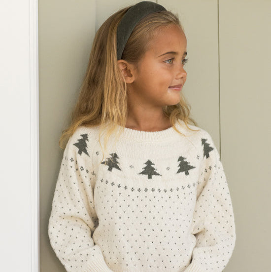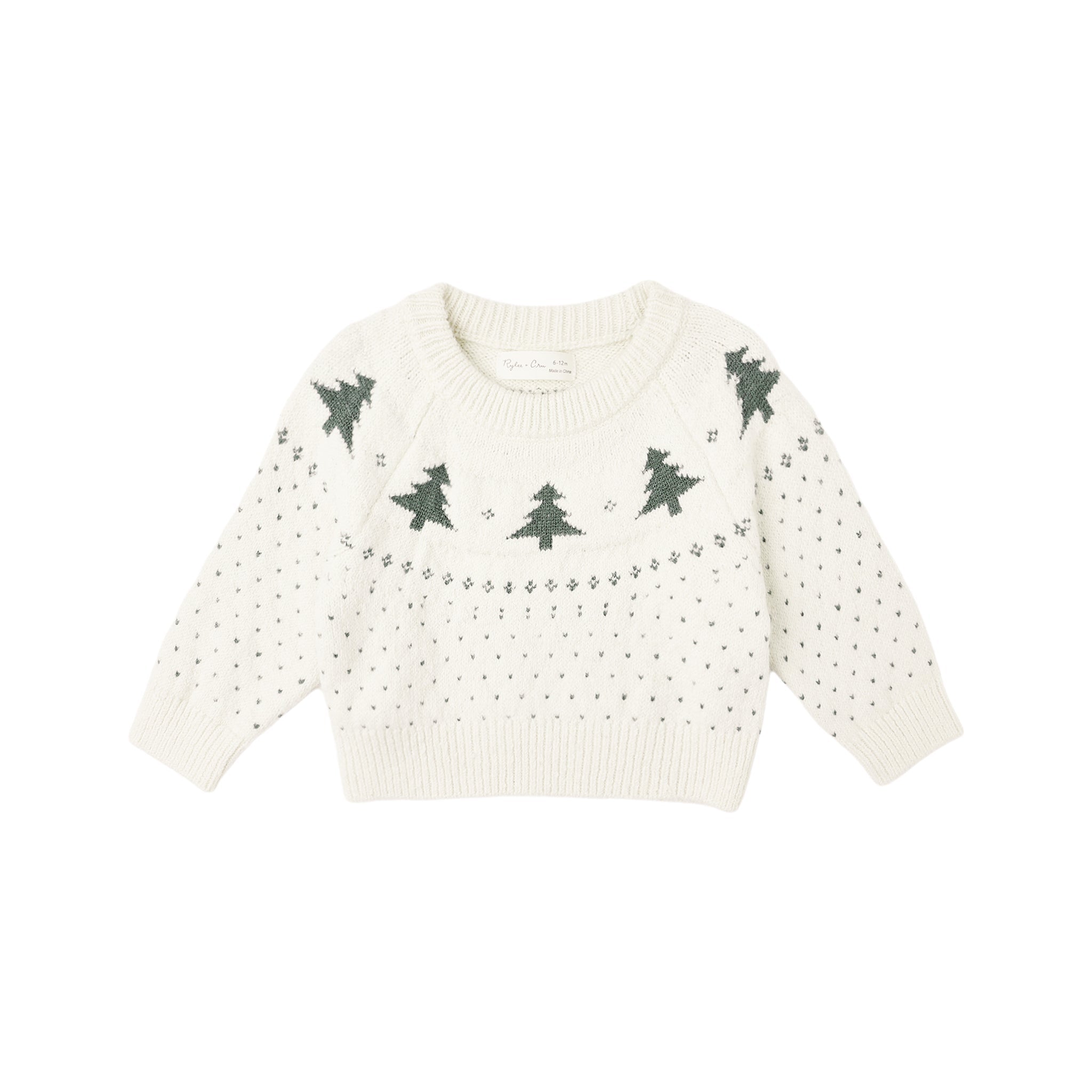 This Fair Isle Sweater is a cozy knit with a classic tree motif and timeless fair isle patterning. Designed in a natural base with green details, it’s the perfect blend of comfort and charm for chilly days.