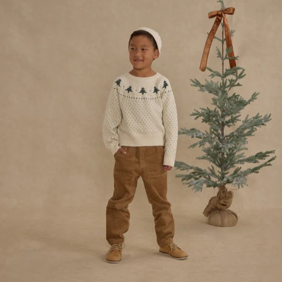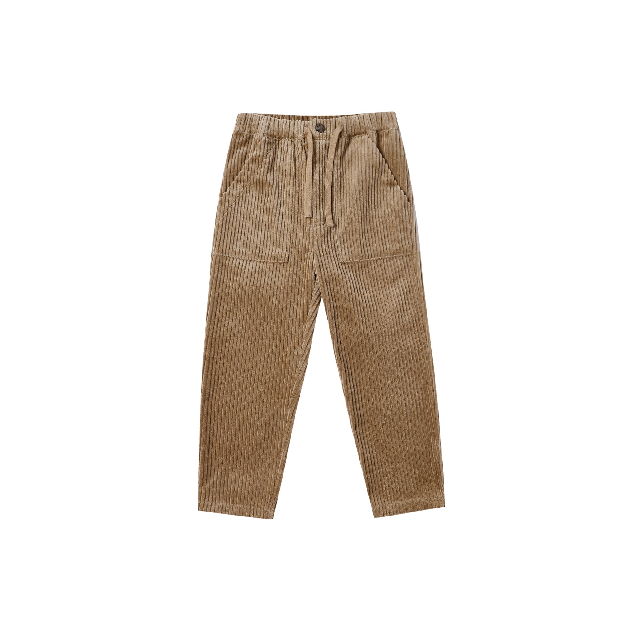 The Oliver Pant, crafted from soft stretch corduroy, features an elastic waistband with an adjustable drawstring and functional utility pockets for everyday use.