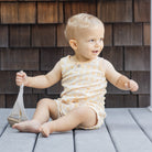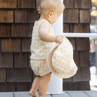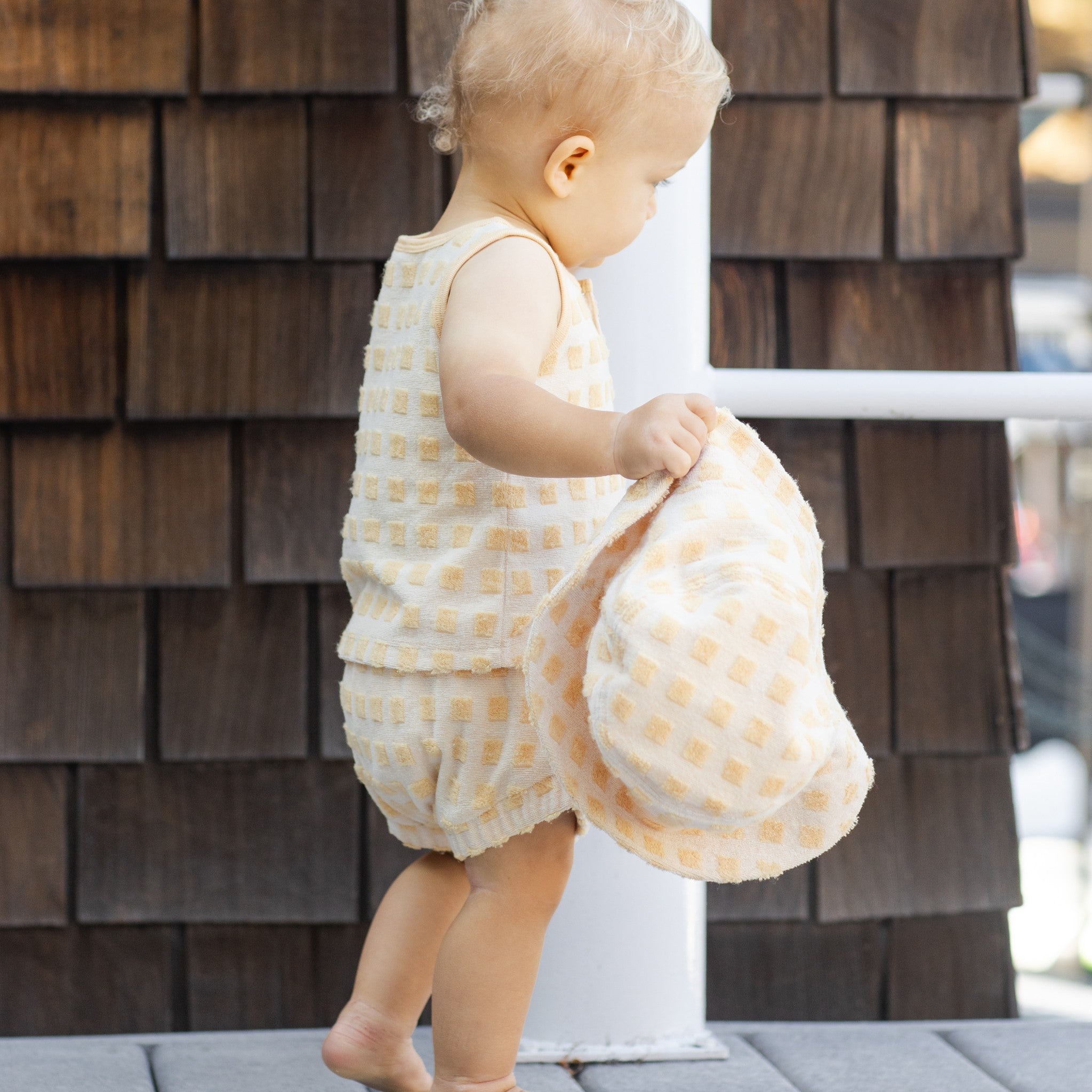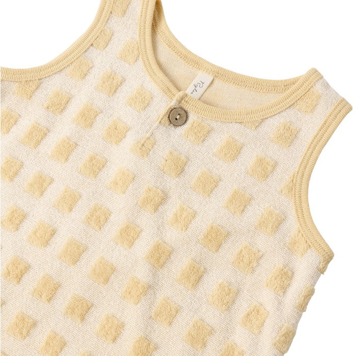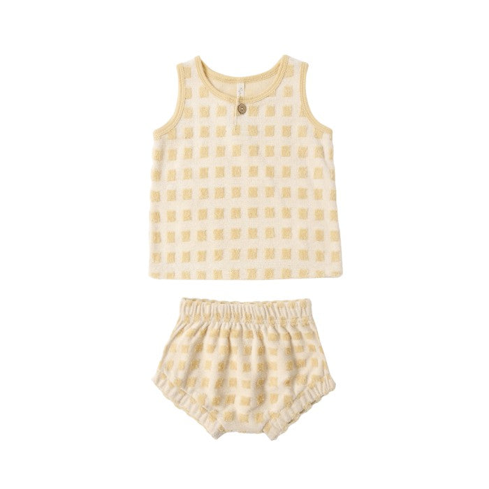 This everyday terry cloth set comes with a tank top with button details, and coordinating bloomers with an elastic waist and legs.