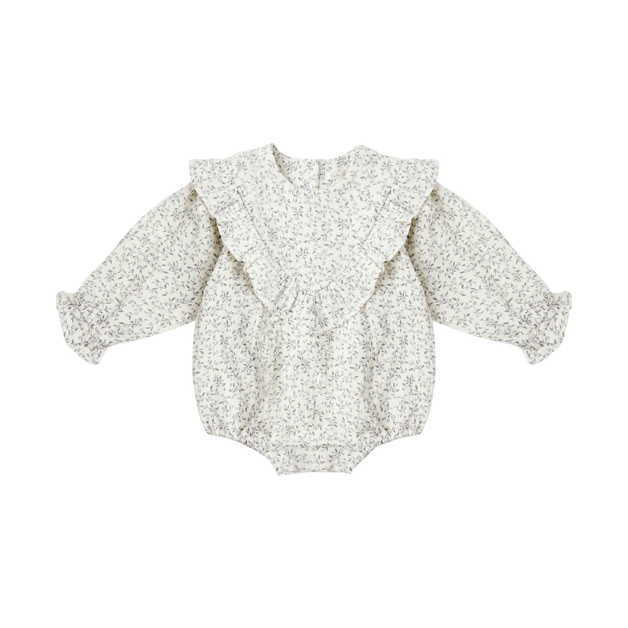 Rylee + Cru's Winnie Romper features darling V ruffle trim, elasticized sleeve and leg openings for a sweet bubble silhouette, and bottom snaps for easy changes.