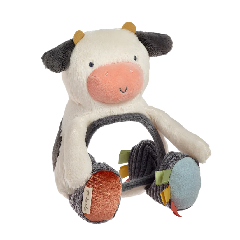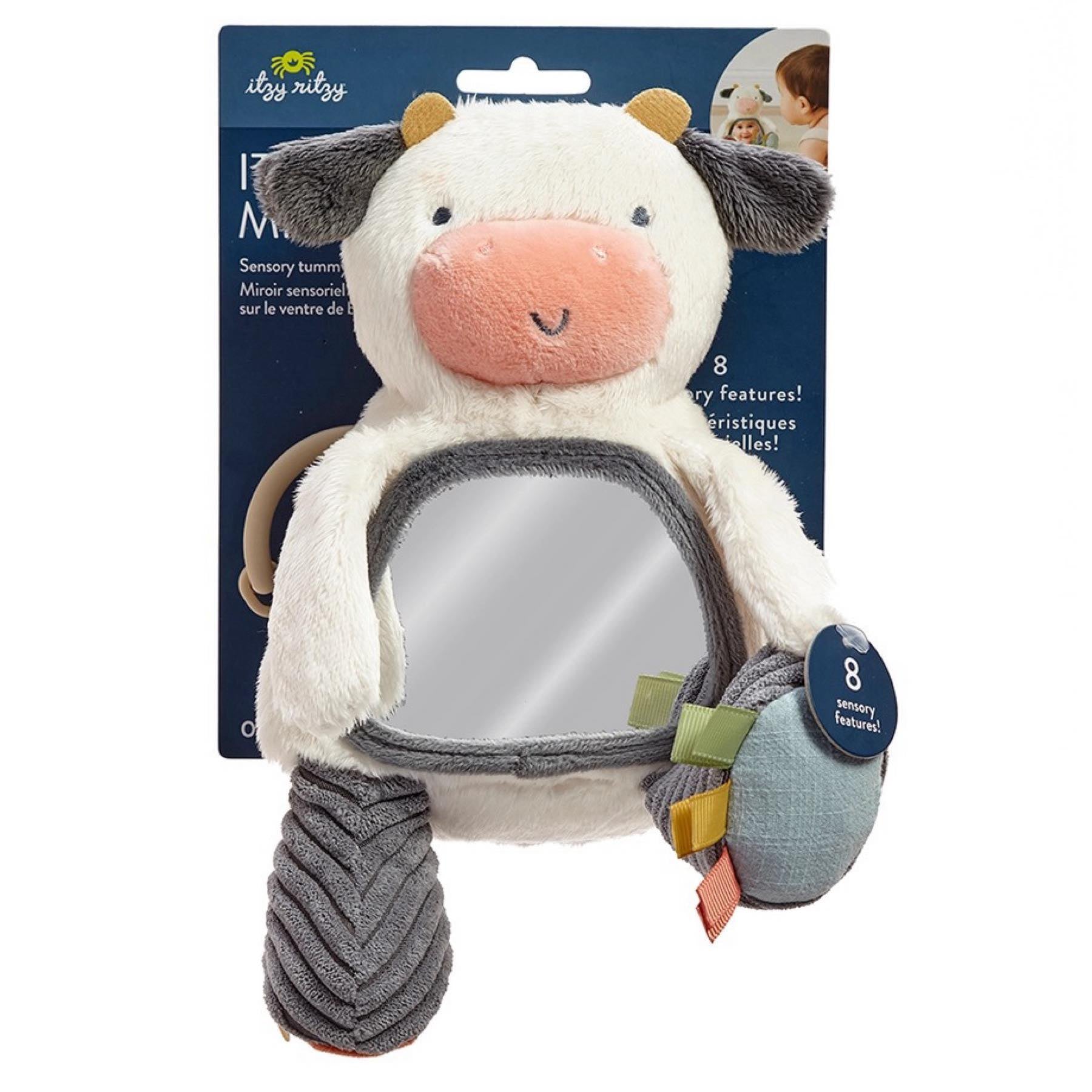 Carmen the Cow! Objects in the Itzy Bitzy Mirror™ are cuter than they appear! Watch as your babe smiles at their reflection in the mirror, reaches for the textured feet, and grasps for the ribbons. Attach to your car seat for on-the-go entertainment and sensory play. Tummy time never looked better!
