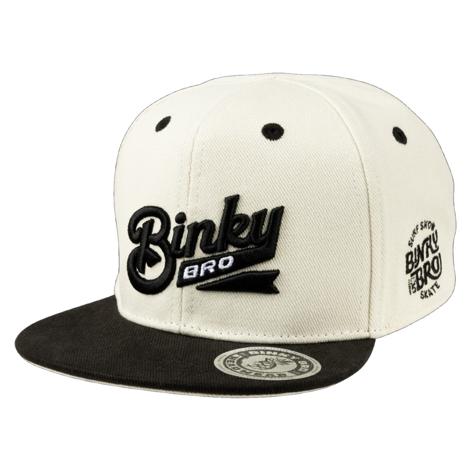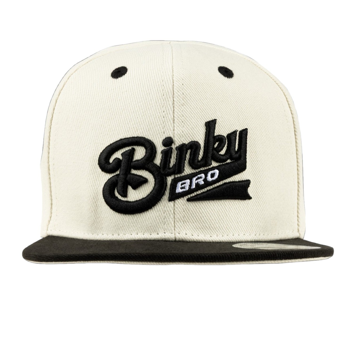 The Jack snapback hat has cream paneling with a branded "BinkyBro" logo on front. This hat is 100% cotton.