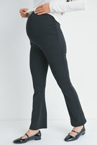 The rib knit stretch fabric ensures a slim, comfortable fit that moves with you, while the subtle kick flare hem adds a modern touch. Perfect for pairing with blouses, sweaters, or casual tops, these pants can easily be dressed up or down for any occasion.
