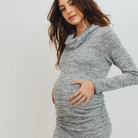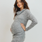 The Heather Grey Cowl Neck Maternity Sweater Dress is a timeless piece designed for style and comfort throughout pregnancy. With its soft knit fabric, chic cowl neckline, and ruched sides, this bodycon dress flatters your growing bump while keeping you cozy.