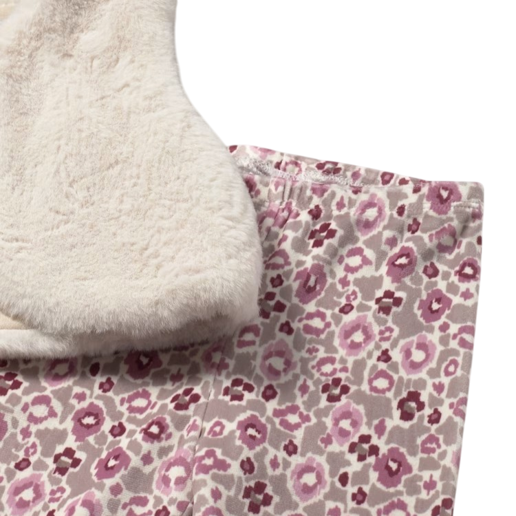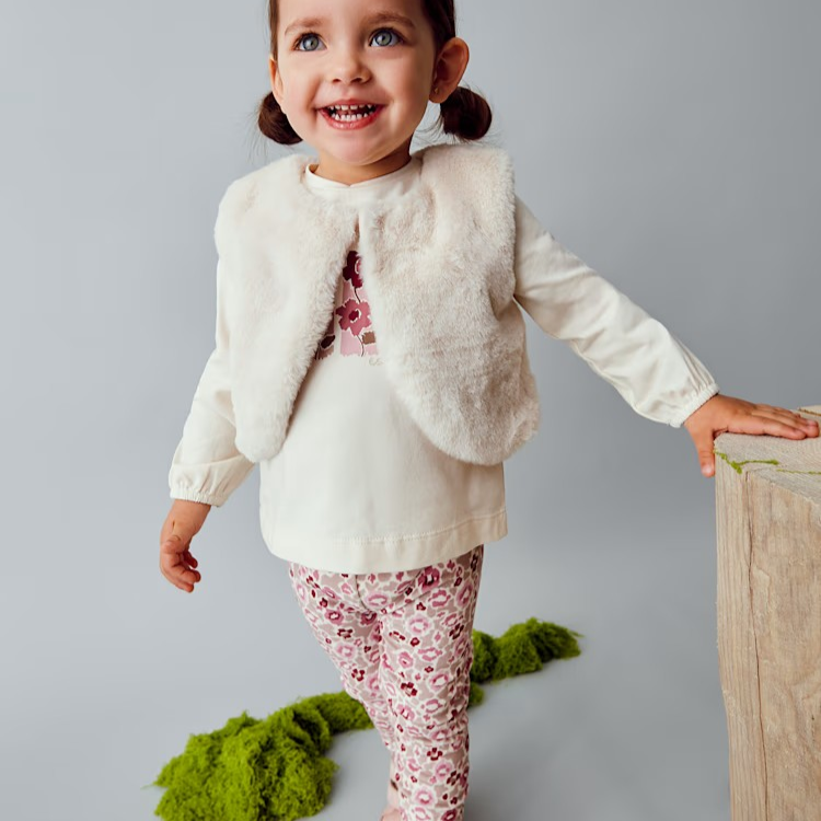 This charming three-piece baby set includes a soft jersey long sleeve tee with elastic cuffs, a round neckline, and a back snap closure for easy dressing. Adorned with a whimsical print in soft pastel tones. A cozy layering piece with hidden clasp fastenings at the front, offering style and comfort and patterned Leggings with stretchy knit bottoms with an elasticated waistband featuring complementary printed patterns for a coordinated look. Crafted in Spain, this set combines style with little‑one comfort.