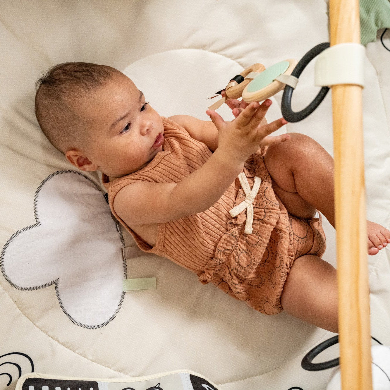 - Double-padded, extra-soft play mat with stand-alone wooden toy arch