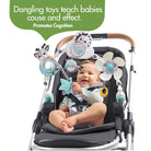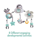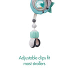 The Magical Tales Sunny Stroll take along flexible arch includes a variety of delightful activities to develop the senses and keep baby amused. The arch angle can be adjusted to give your baby easy access to the toys, and its adjustable clips connect to most strollers in a snap! The Magical Tales Sunny Stroll is great for development from day one. The black and white color scheme with the bursts of pastel encourages baby to reach out and touch the dangling toys, or catch a glimpse of their smile in the adorable rattle bird with a mirror. As baby gets a little older, the Sunny Stroll dangling toys encourage grabbing and pulling – teaching them about cause and effect. The baby-activated propeller will put a smile on your little one's face.