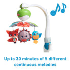 The Meadow Days Take-Along Mobile is designed to support your baby’s development at home or on the go. The engaging black and white contrasts and colorful hanging toys spin to provide visual stimulation and fine motor skill development for your little one. Babies can practice their communication and language skills while lying in their crib or sitting in their stroller by cooing at the smiling characters. The mobile’s clever design makes it easy to attach to most play yards, strollers, and bassinets, making it the perfect travel toy. The mobile also features 30 minutes of 5 different melodies to help soothe and amuse your little one at home or on the go.