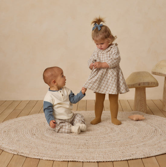 A cozy long sleeve tee with a relaxed fit, featuring contrast sleeves, neckline, and front placket, with soft coconut buttons for easy changes.