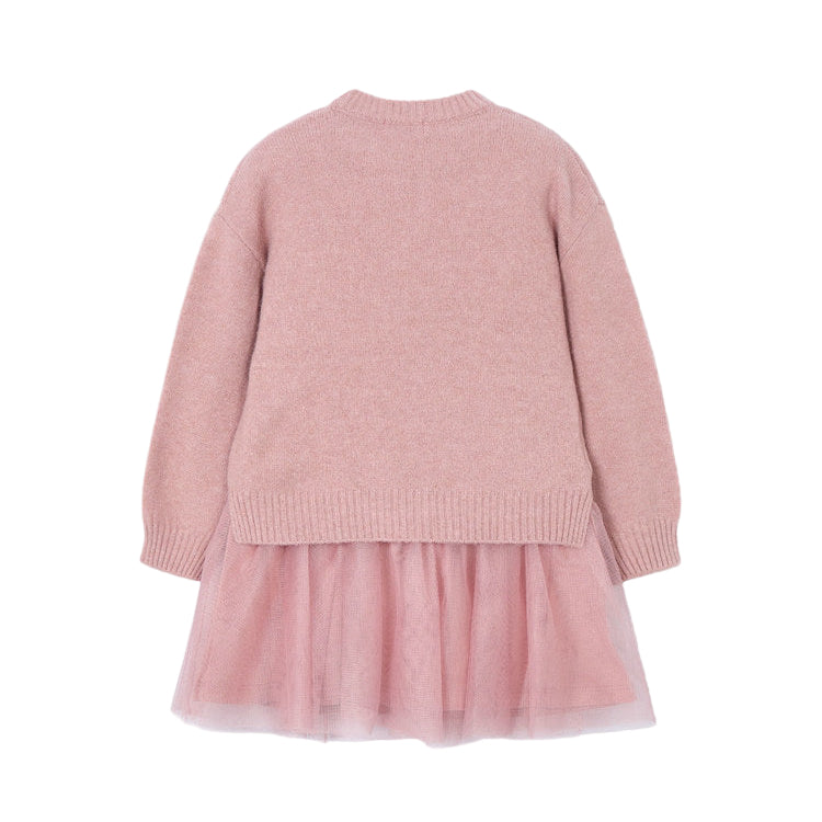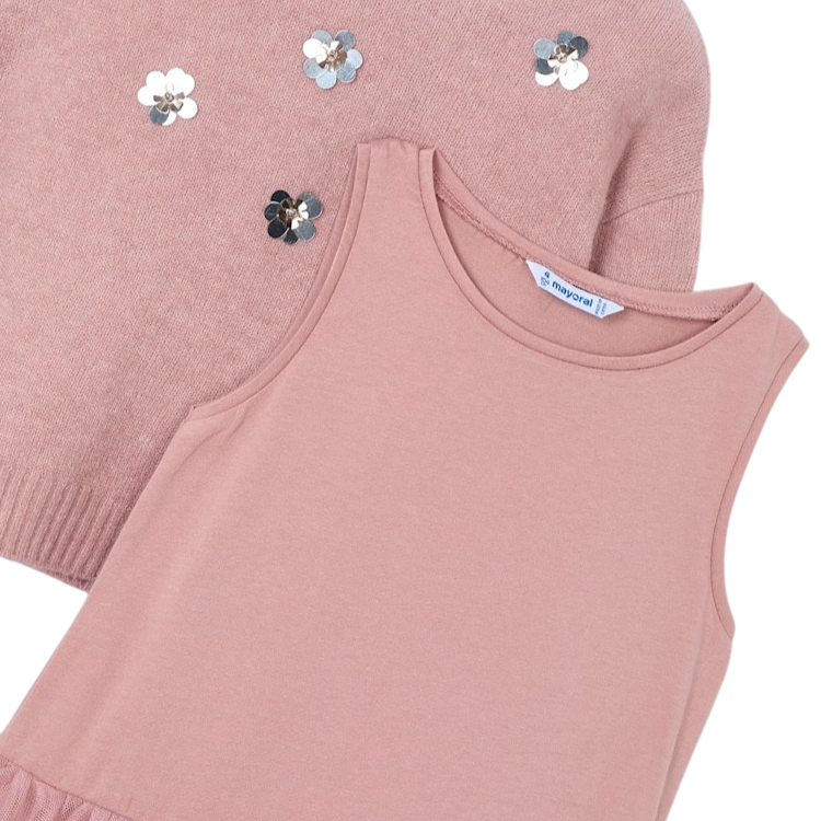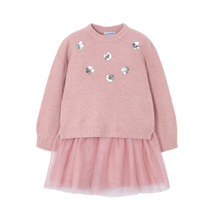 Mayoral Tulle Knit Dress - Makeup. A charming two-piece set for girls crafted from soft knitted fabric with recycled polyester.